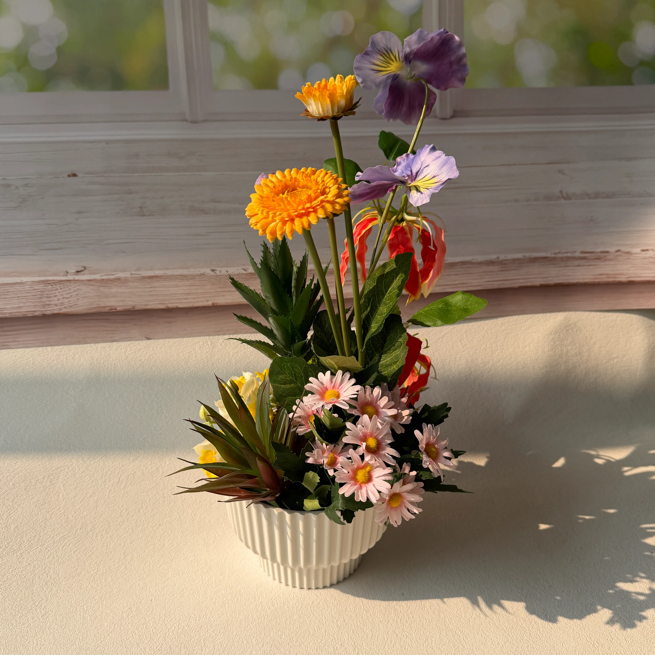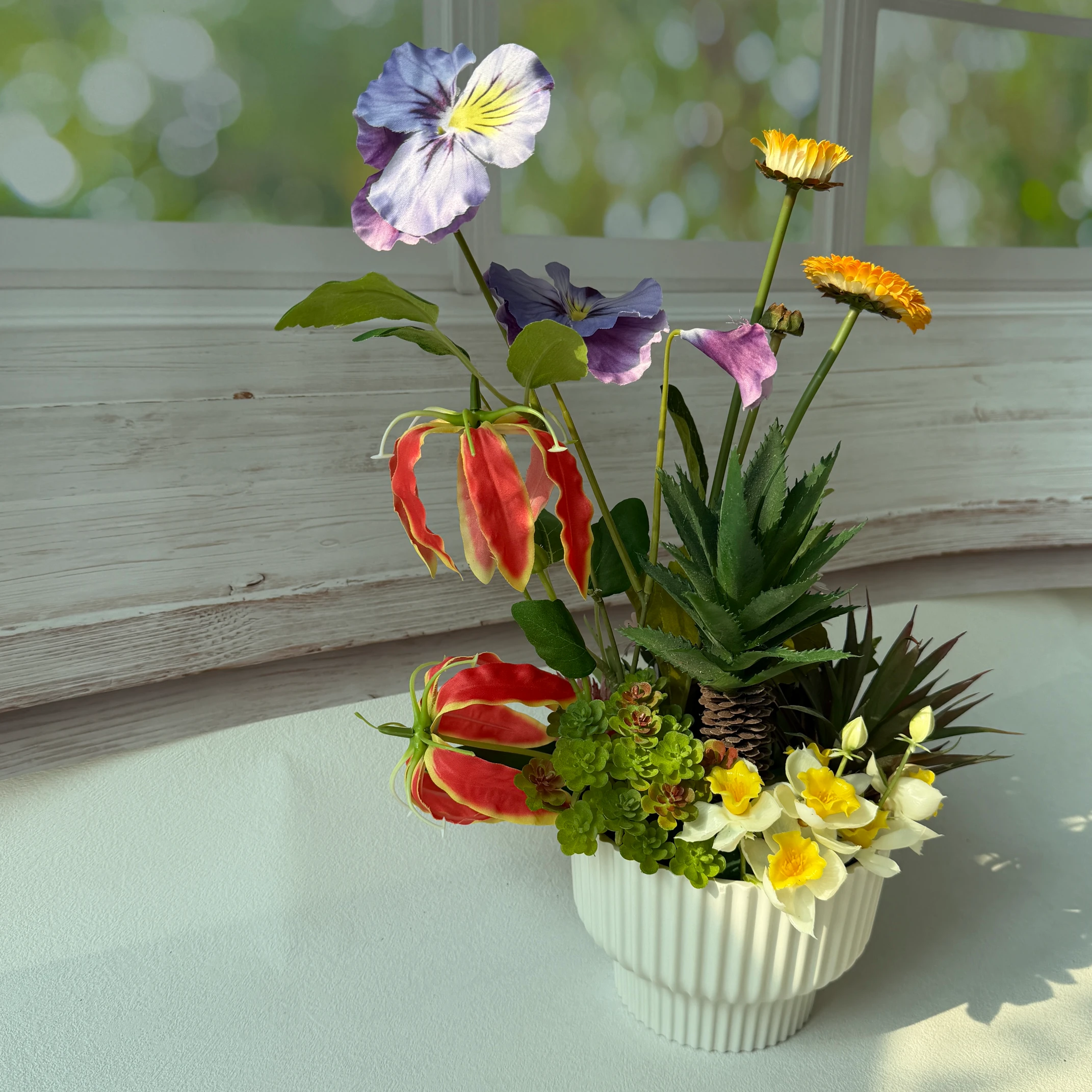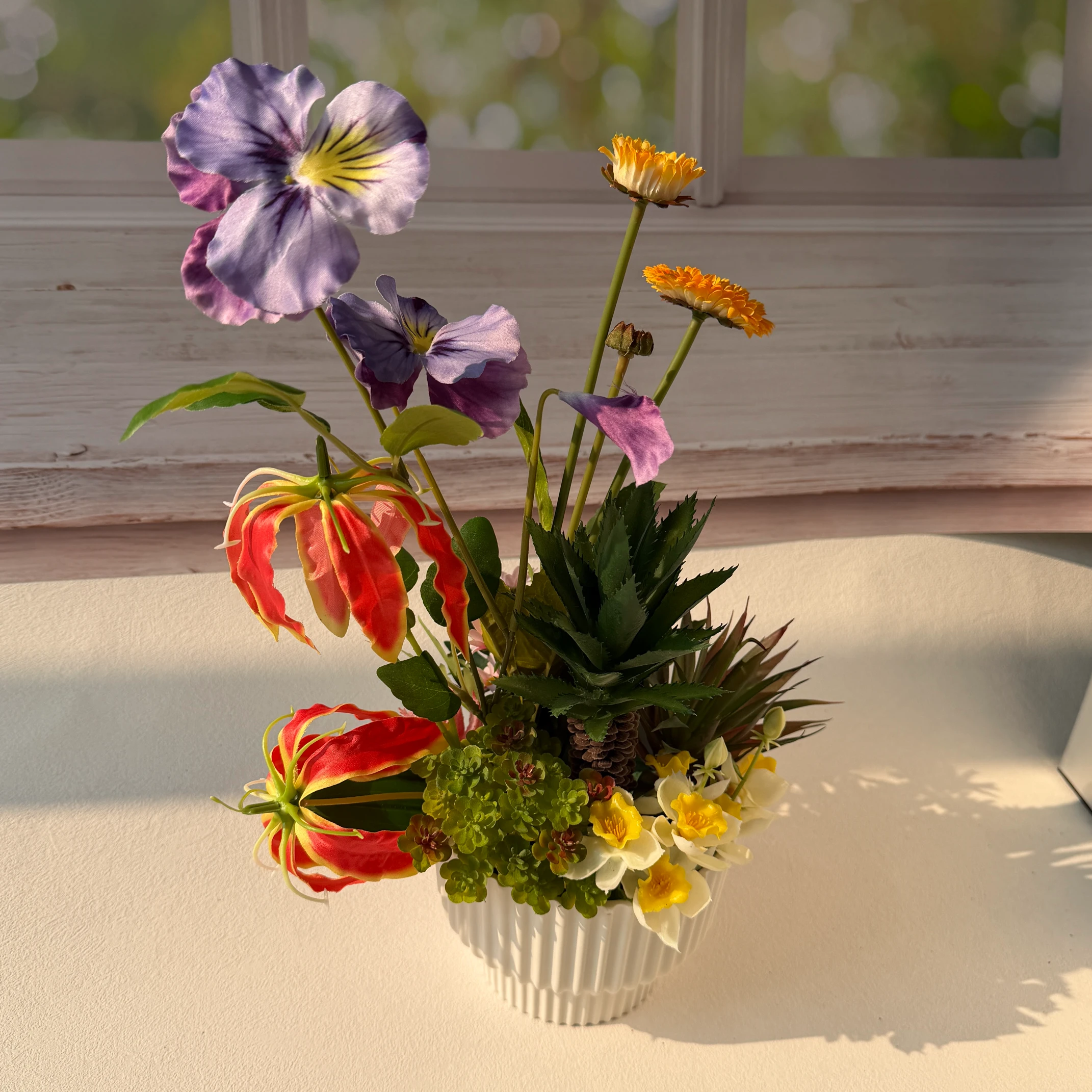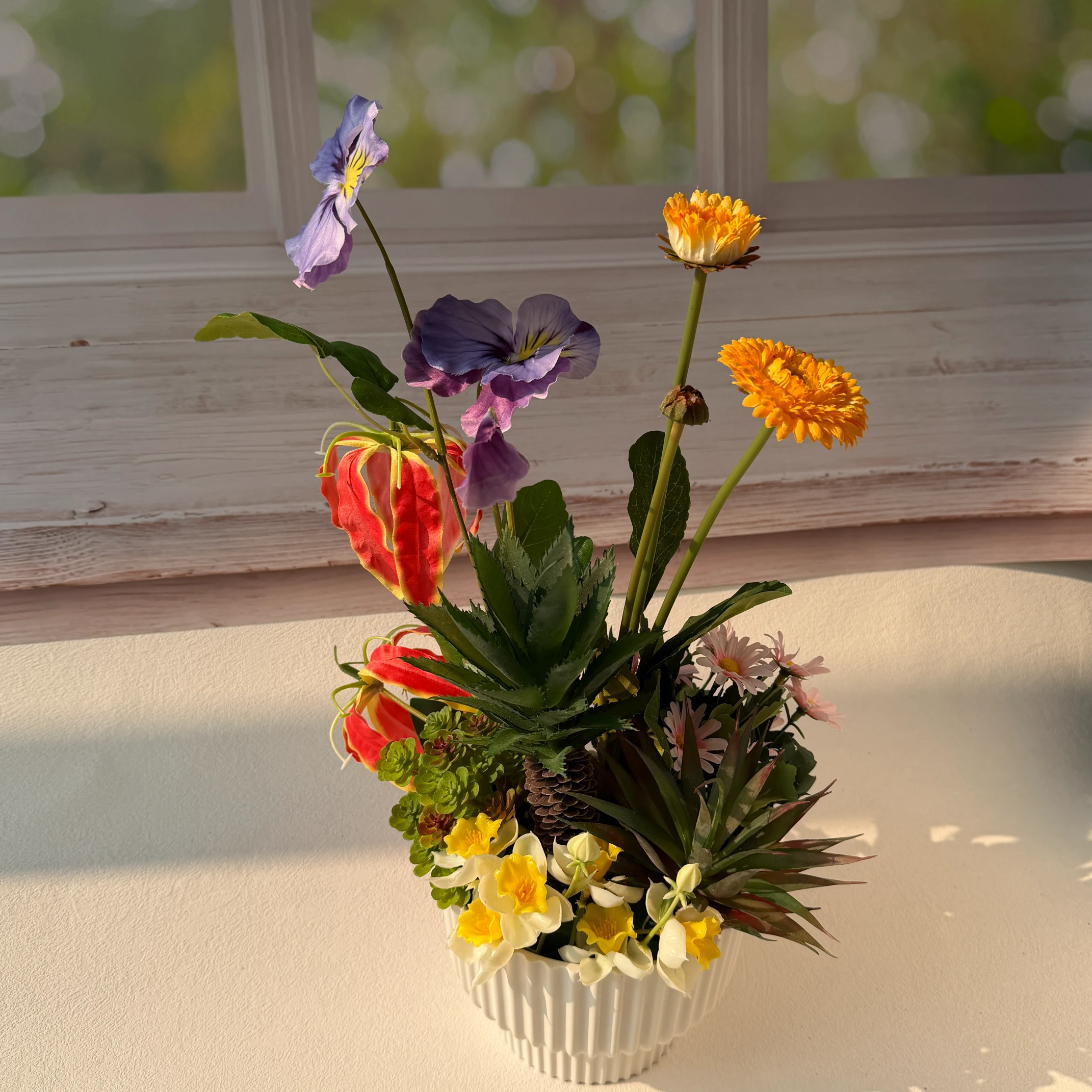 As suculentas são conhecidas por sua durabilidade, enquanto as flores silvestres trazem um frescor único. Juntas, elas criam um arranjo que se mantém bonito com mínimos cuidados. Sua versatilidade permite que seja utilizado em mesas, prateleiras ou como presente memorável.
