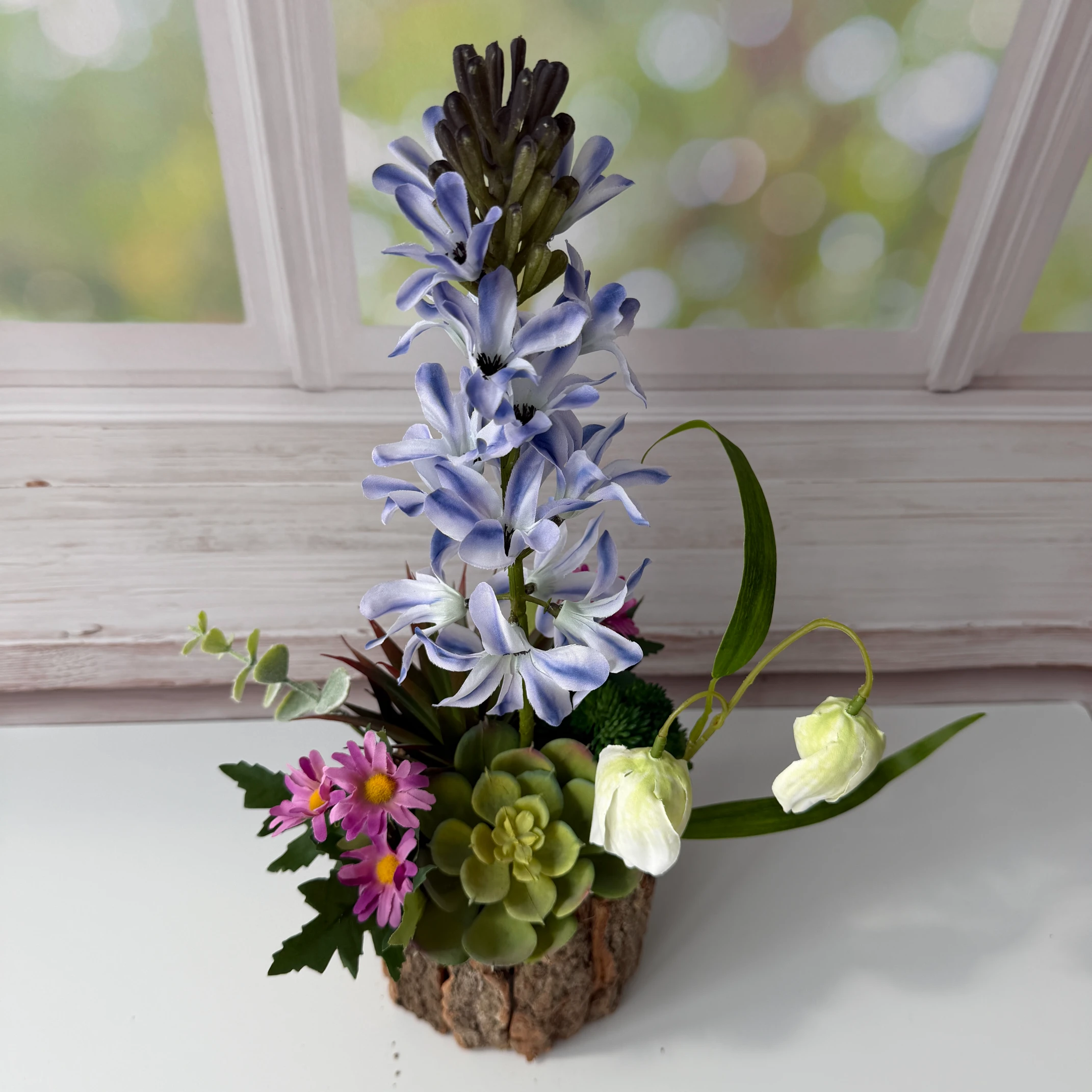 O arranjo captura a essência das flores de jacinto em plena floração, completado por um vaso de madeira que adiciona um toque rústico e contemporâneo. Cada detalhe é desenhado para replicar a beleza da natureza, tornando-o um excelente complemento para salas de estar, escritórios ou até presentes especiais.