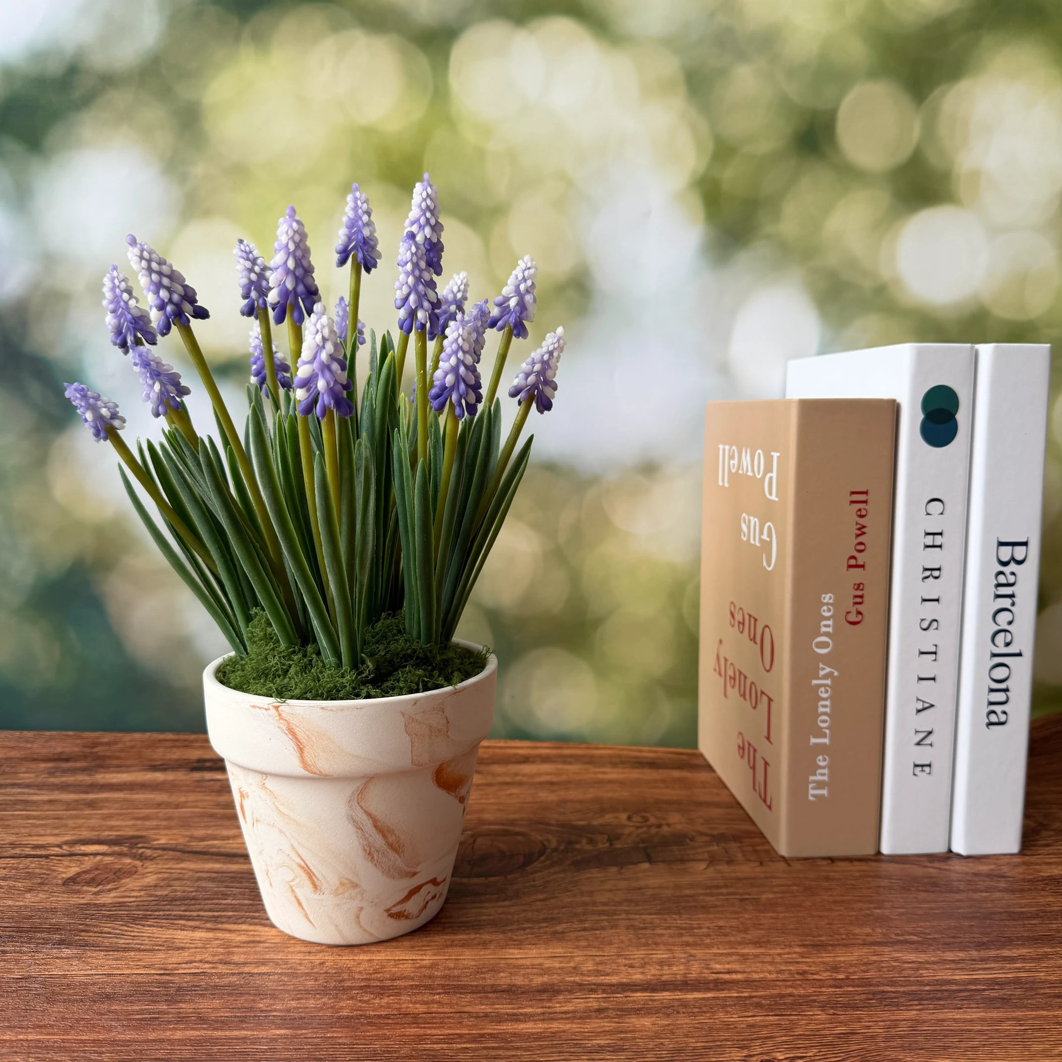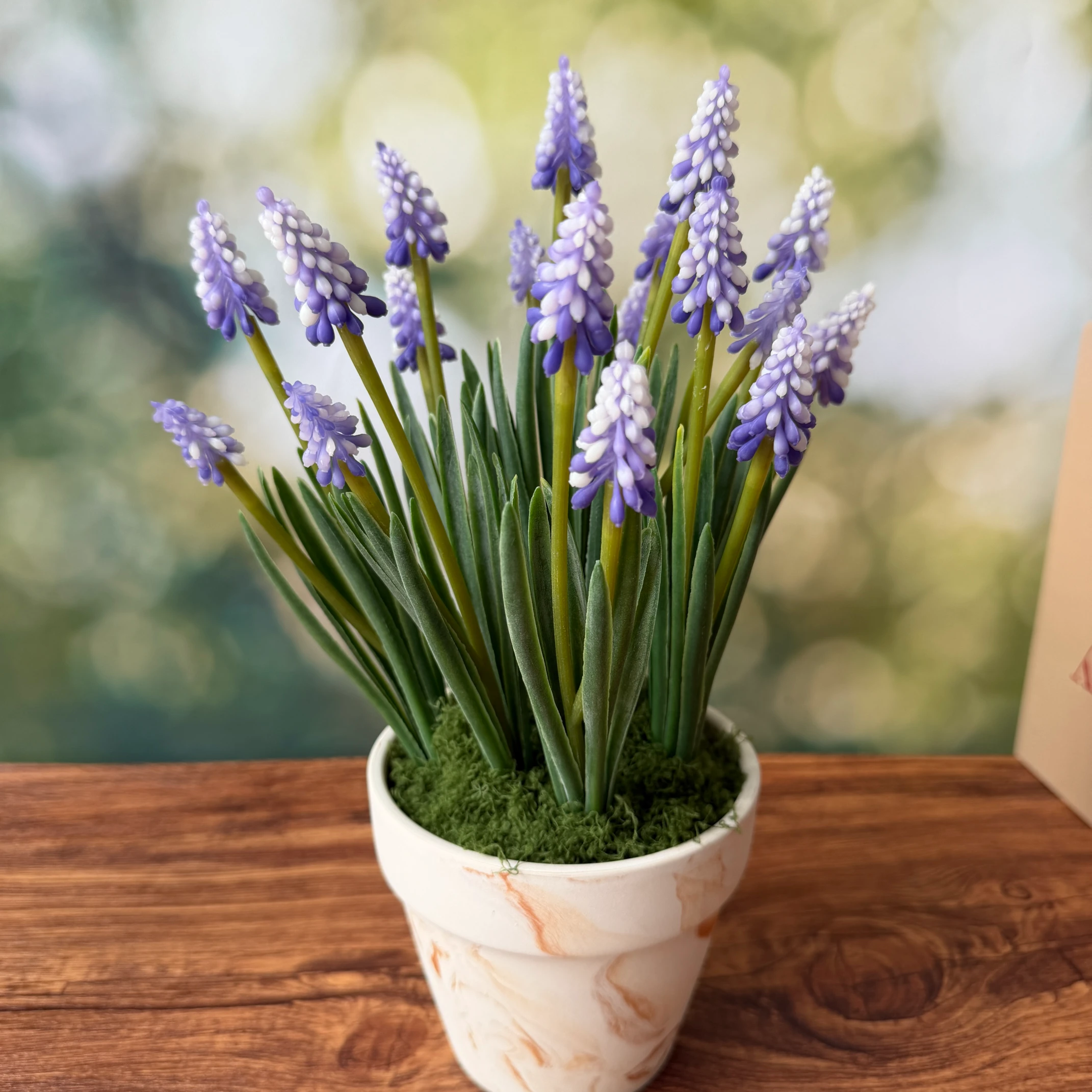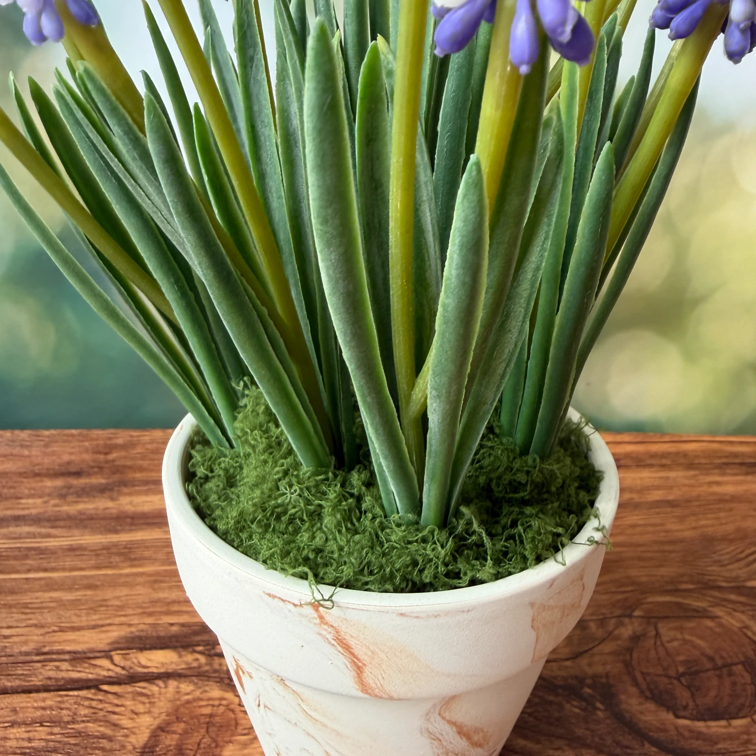 O vaso em mármore exala classe e modernidade, complementando a vibrante tonalidade roxa do jacinto. Este item é perfeito para decorar casas, escritórios ou eventos, criando um ambiente acolhedor e estilizado em qualquer espaço.