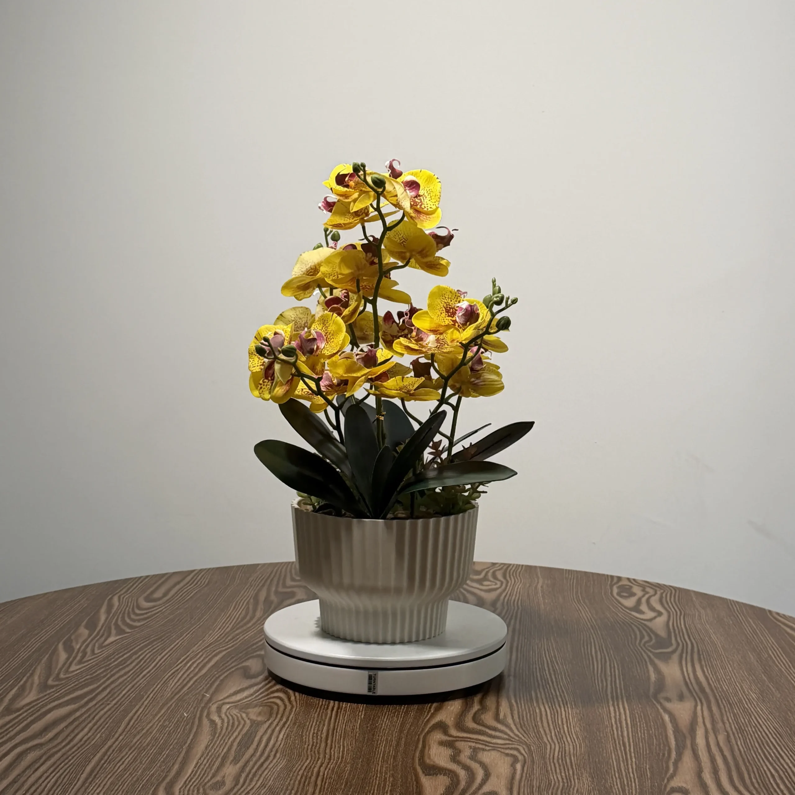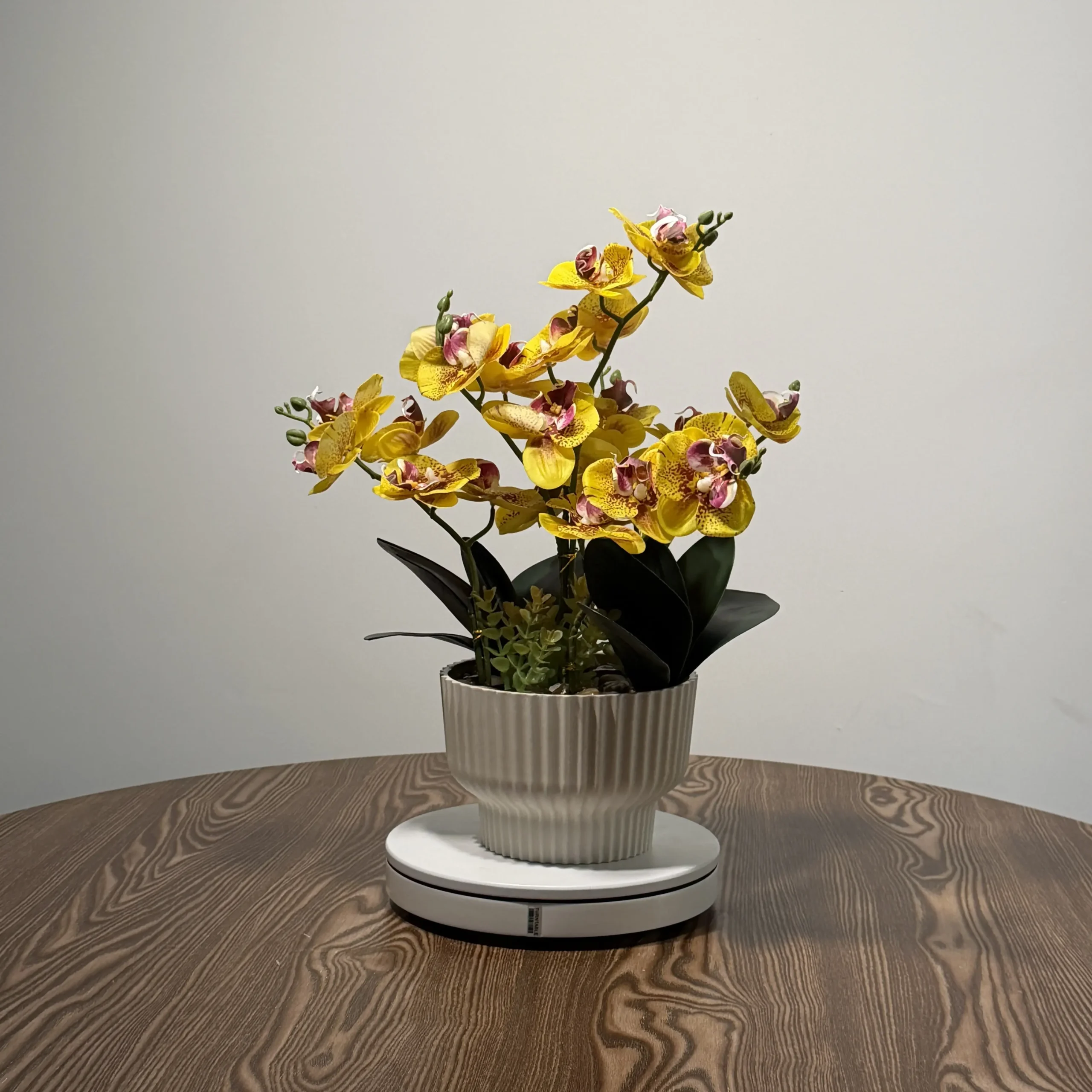 Adicione um toque de sofisticação ao seu lar ou escritório com esta orquídea artificial de pétalas amarelas e delicados pontos vermelhos, complementada por suculentas na base. Seu design elegante e realista, incluindo folhas escuras e um centro rosado vívido, é perfeito para criar ambientes acolhedores e modernos.