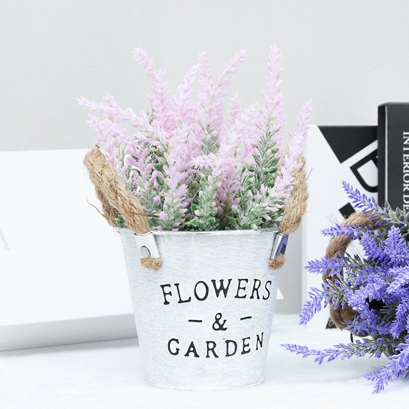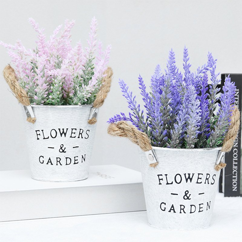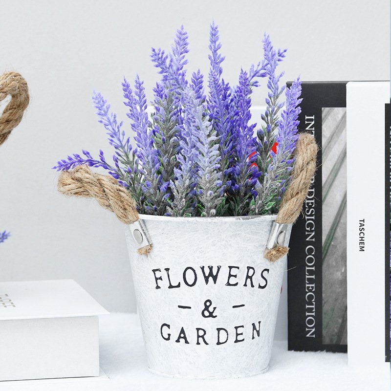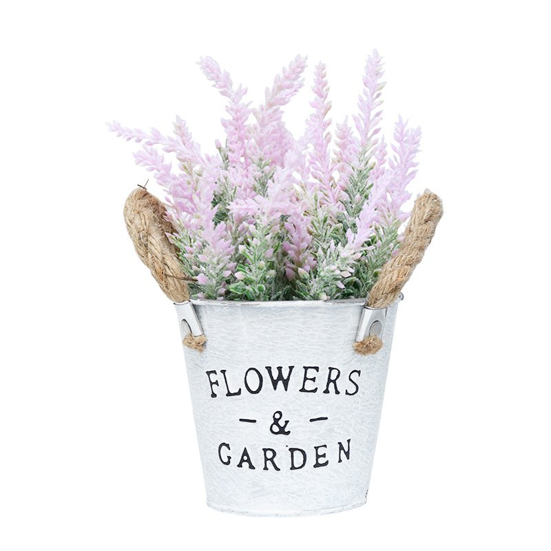 A peça é acomodada em um balde de metal galvanizado branco desgastado, gravado com a inscrição “FLOWERS & GARDEN”. Com alças de corda de juta, o design combina perfeitamente com decorações campestres, rústicas ou vintage, sendo ideal para prateleiras, escrivaninhas e áreas comuns.