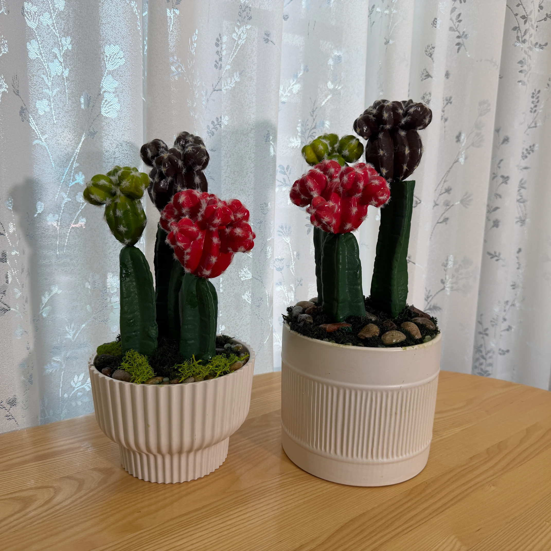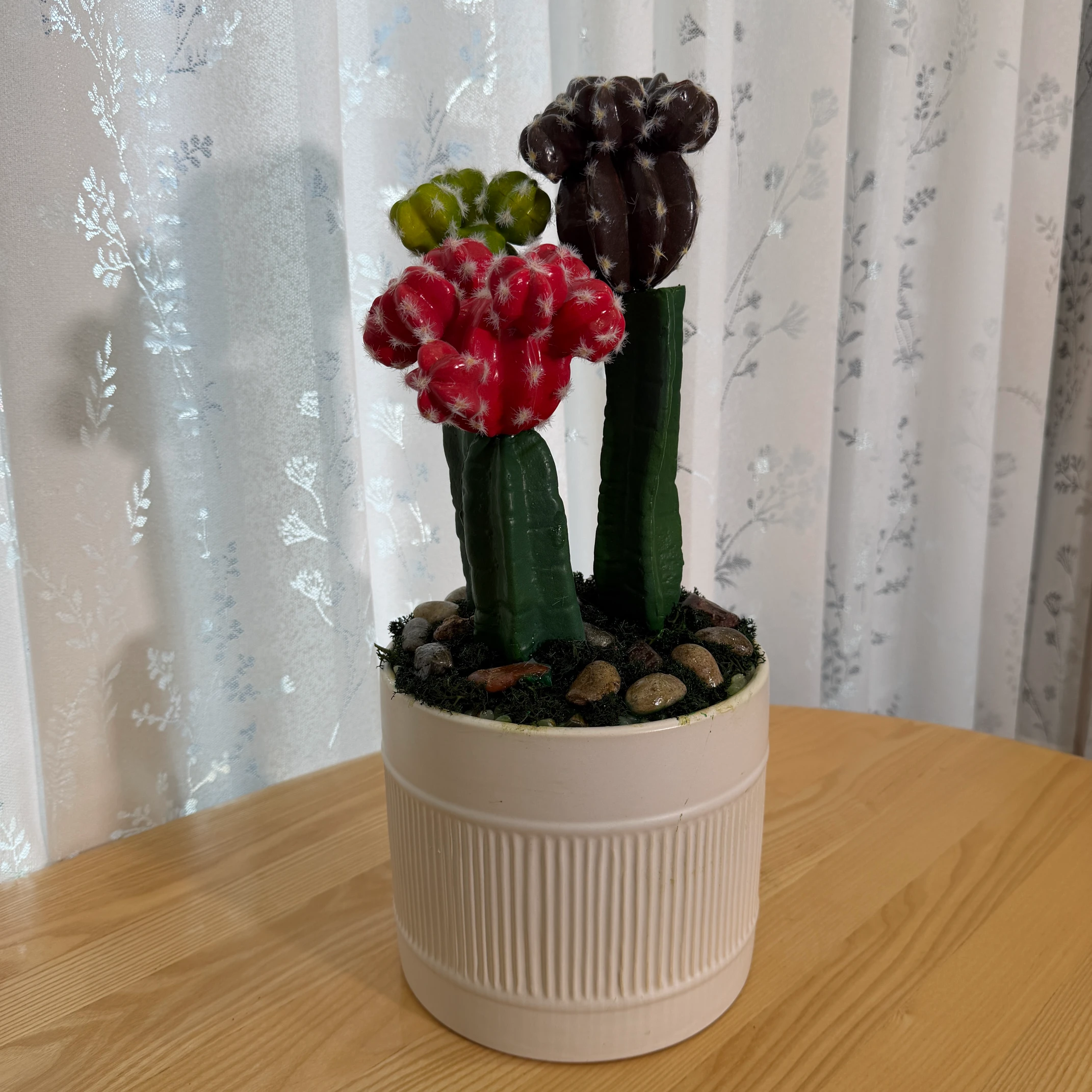 Este arranjo de cactos artificiais combina cabeças coloridas (vermelho, verde e marrom) com detalhes de espinhos brancos, montado em um vaso branco com textura de ranhuras verticais. Totalmente artificial, não necessita de rega, luz solar ou cuidados, trazendo um toque vibrante e tropical para qualquer ambiente.