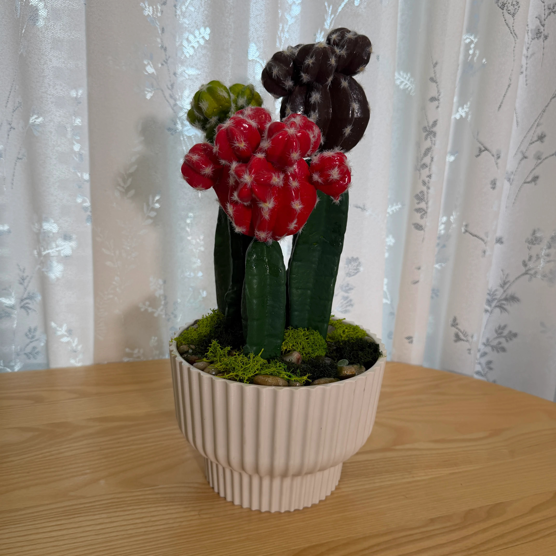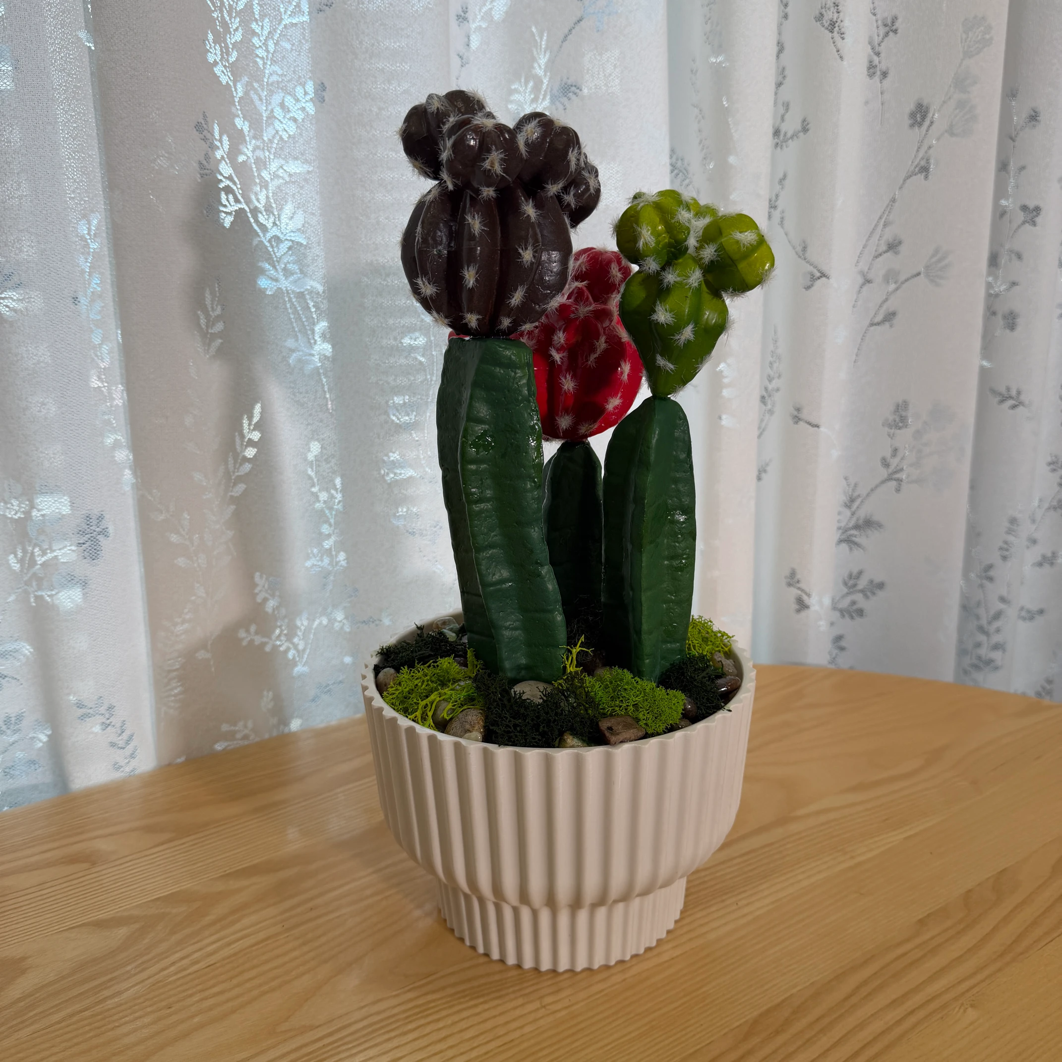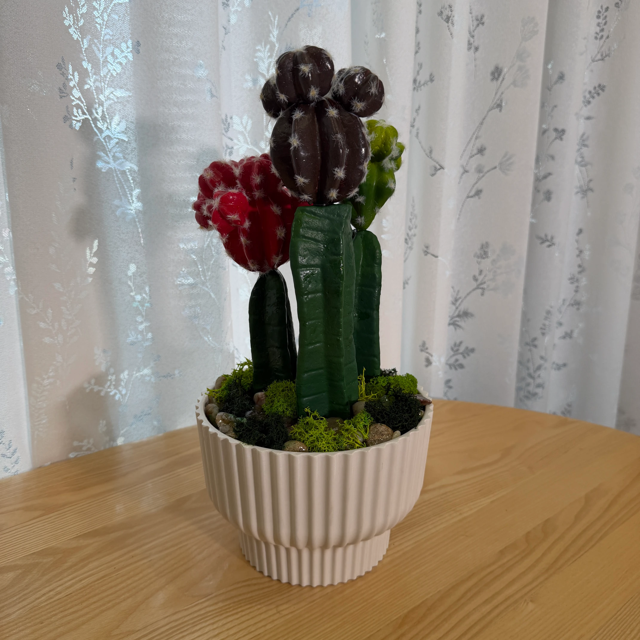 Este arranjo de cactos artificiais combina cabeças coloridas (vermelho, verde e marrom) com detalhes de espinhos brancos, montado em um vaso branco com textura de ranhuras verticais. Totalmente artificial, não necessita de rega, luz solar ou cuidados, trazendo um toque vibrante e tropical para qualquer ambiente.