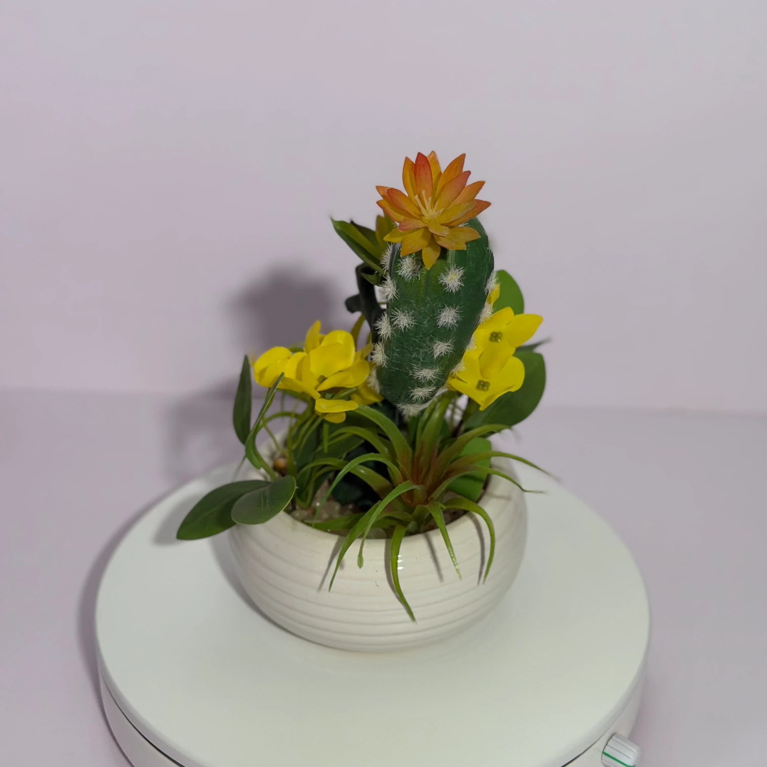 Planta Artificial Decorativa com Suculentas e Flor Branca | Vaso de Cerâmica Branca