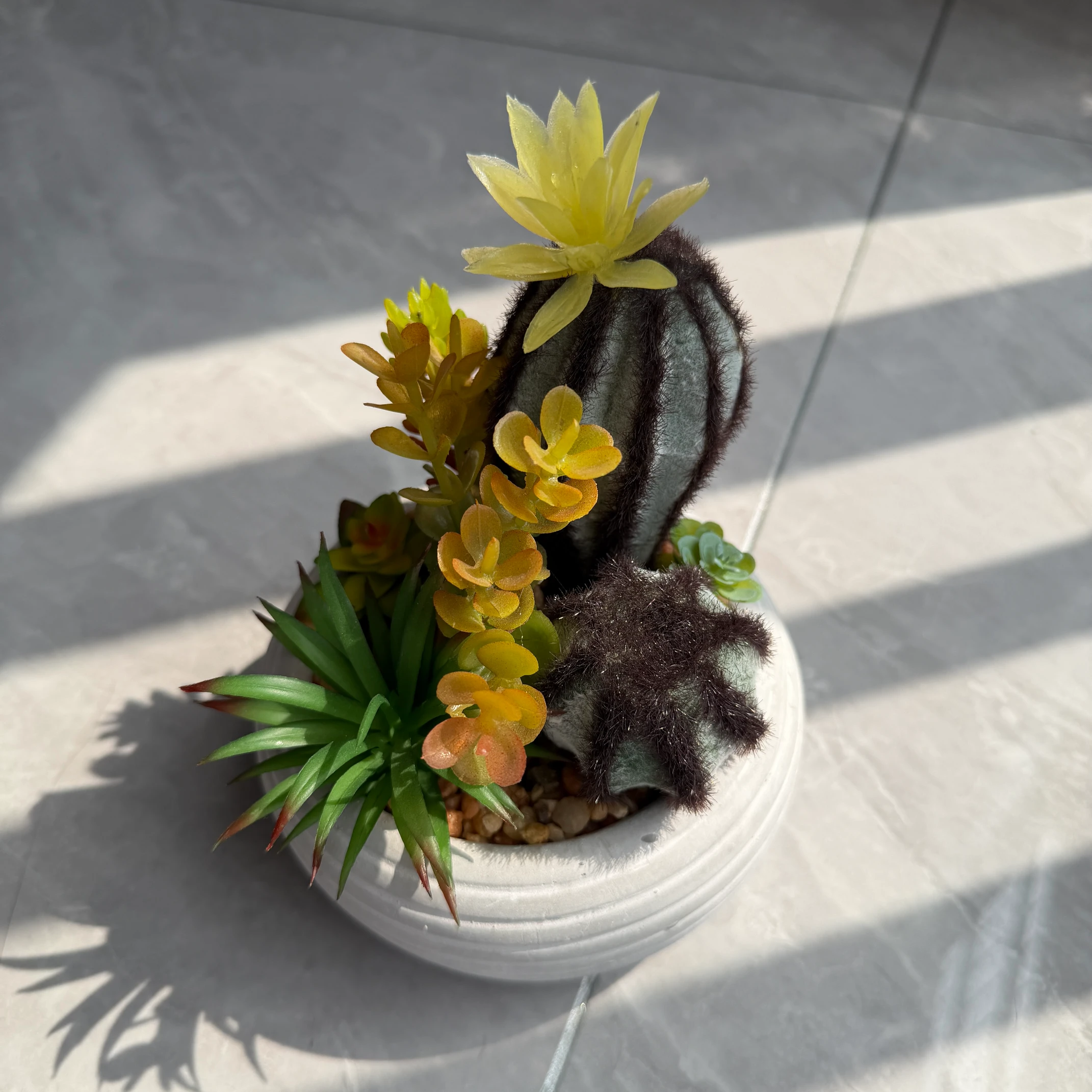 Arranjo de Suculentas e Cacto Artificial | Vaso de Cimento com Textura de Lava