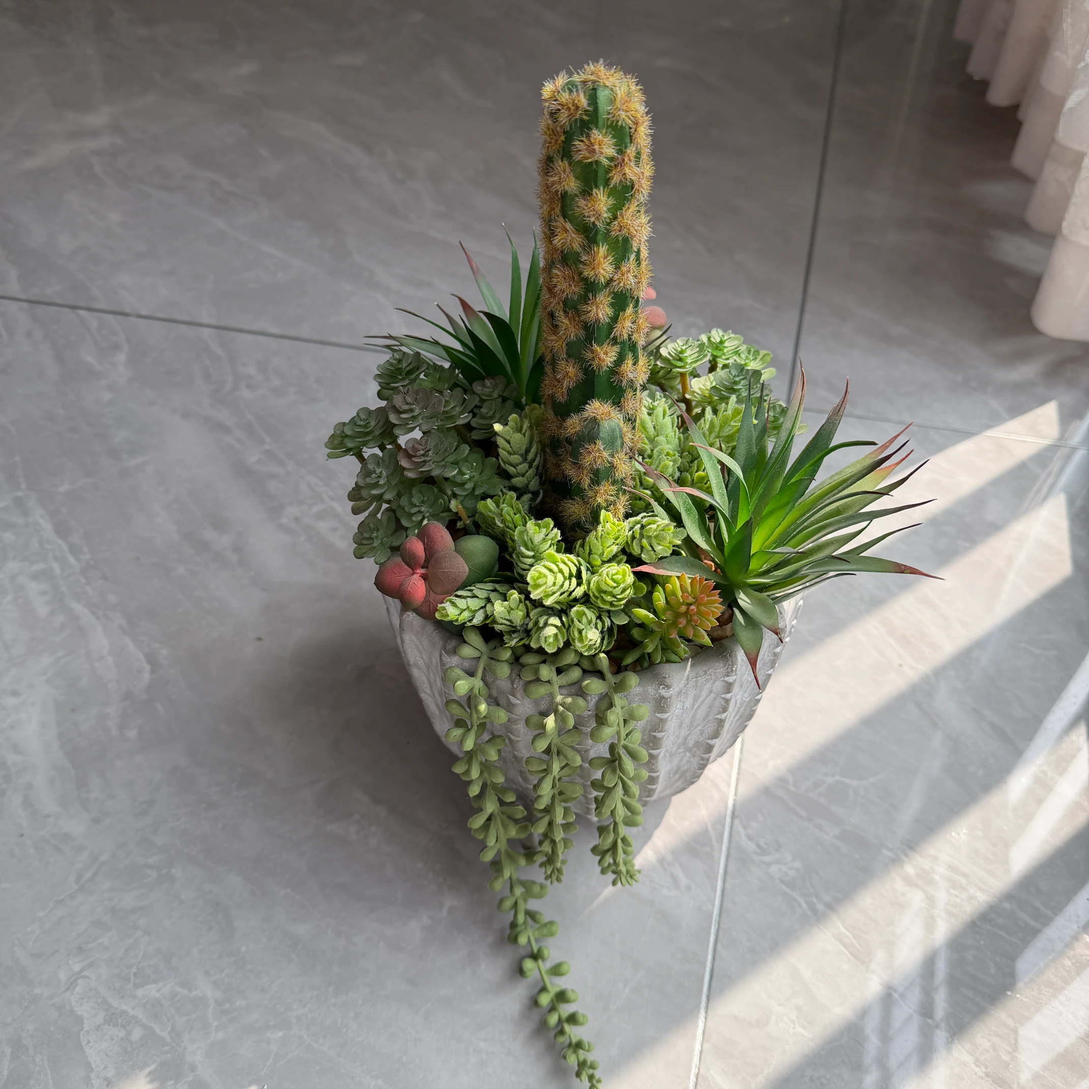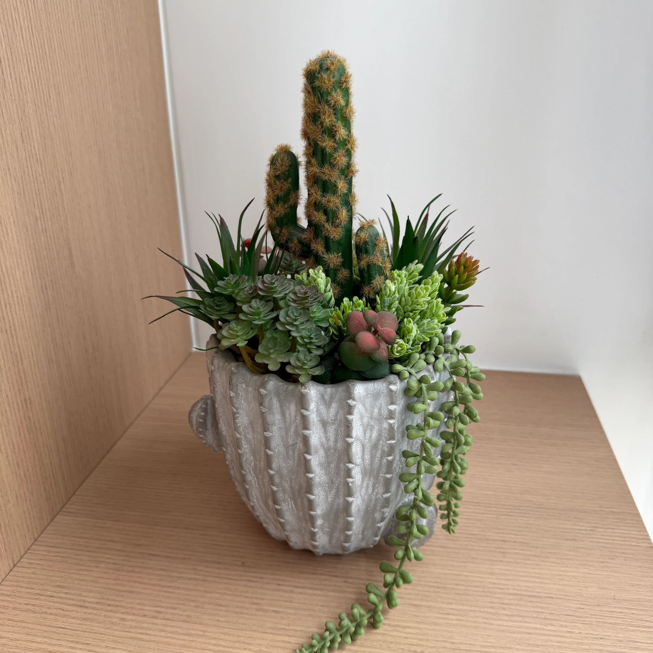 Arranjo de Suculentas e Cacto Artificial | Vaso de Cimento com Textura de Lava