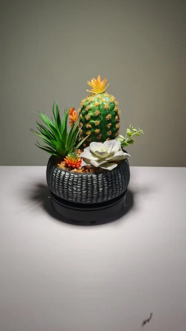 Além de ser visualmente encantador, o cacto é fácil de cuidar, exigindo pouca manutenção. Ideal para quem deseja adicionar um toque de natureza sem compromisso, seja em casa ou no trabalho. O contraste entre o verde do cacto e a flor amarela é uma combinação irresistível que complementa qualquer espaço.