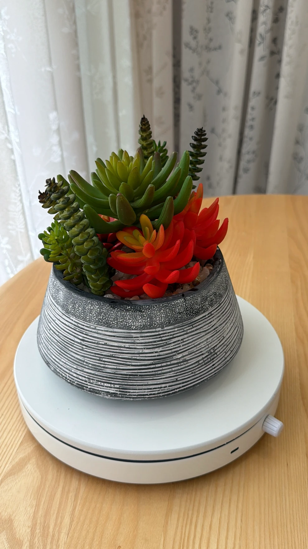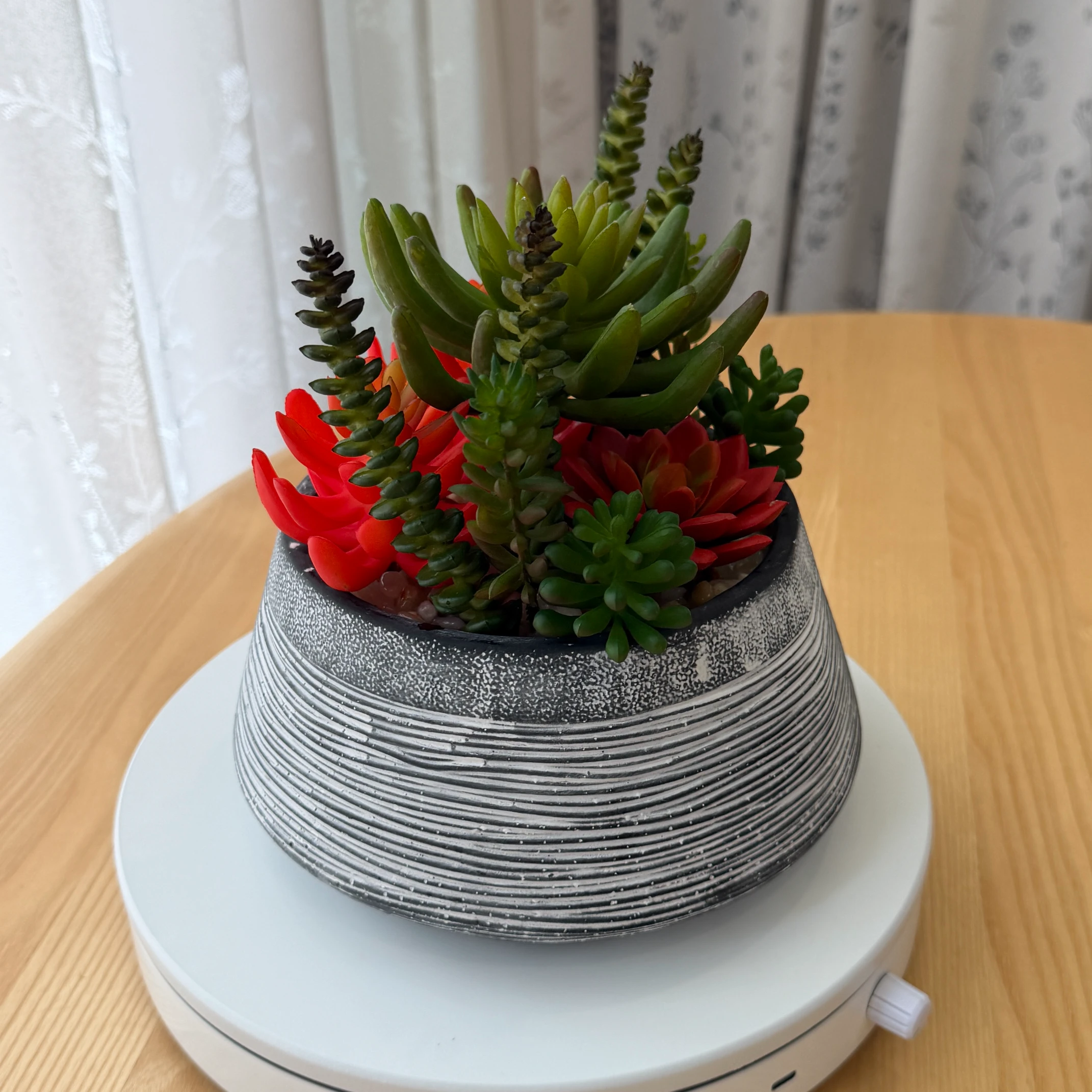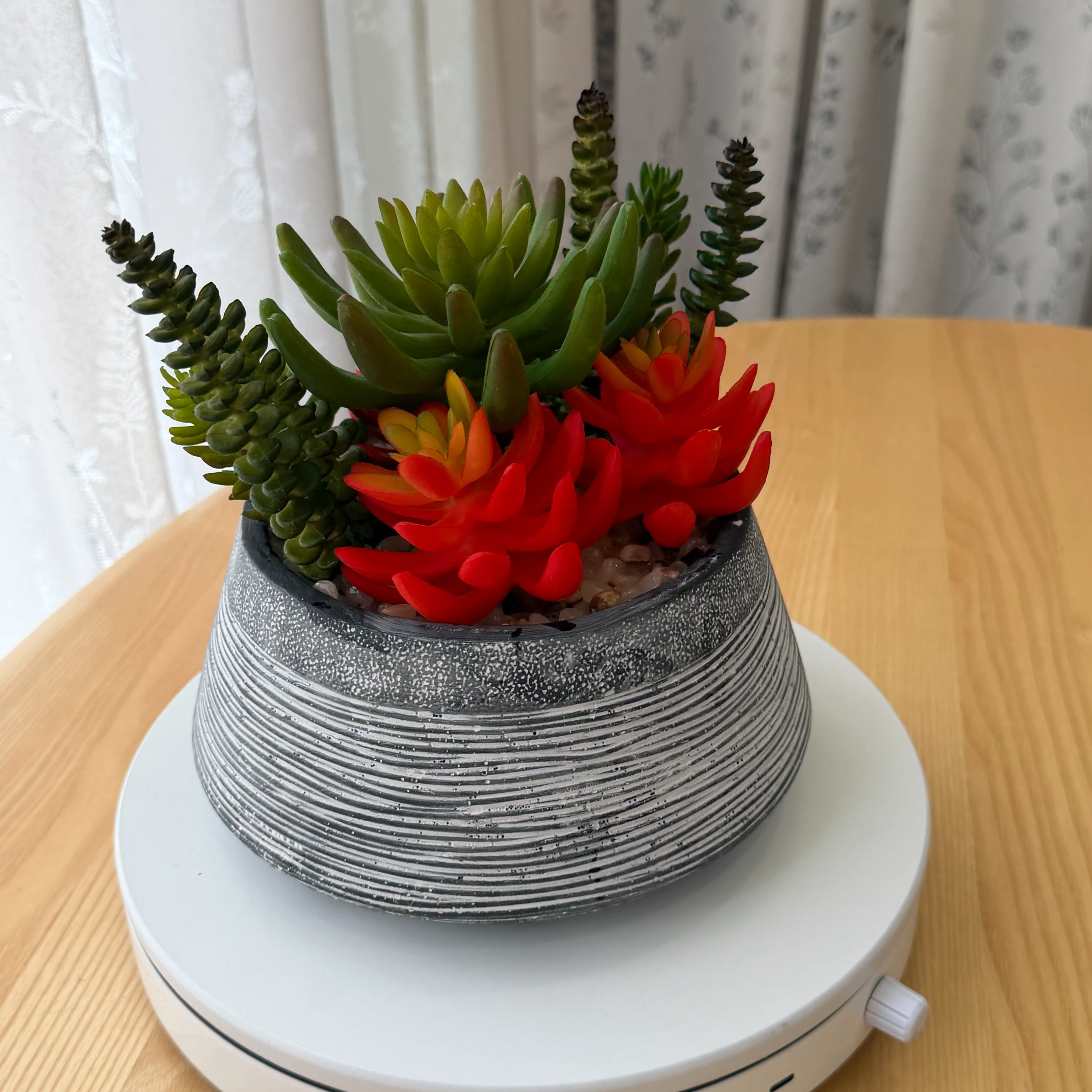 Este arranjo de suculentas artificiais combina variedades em tons de vermelho vibrante e verde, montado em um vaso de cerâmica cinza com textura de riscas horizontais e acabamento envelhecido. Totalmente artificial, não necessita de rega, luz solar ou cuidados, trazendo um toque de elegância e natureza para qualquer ambiente.