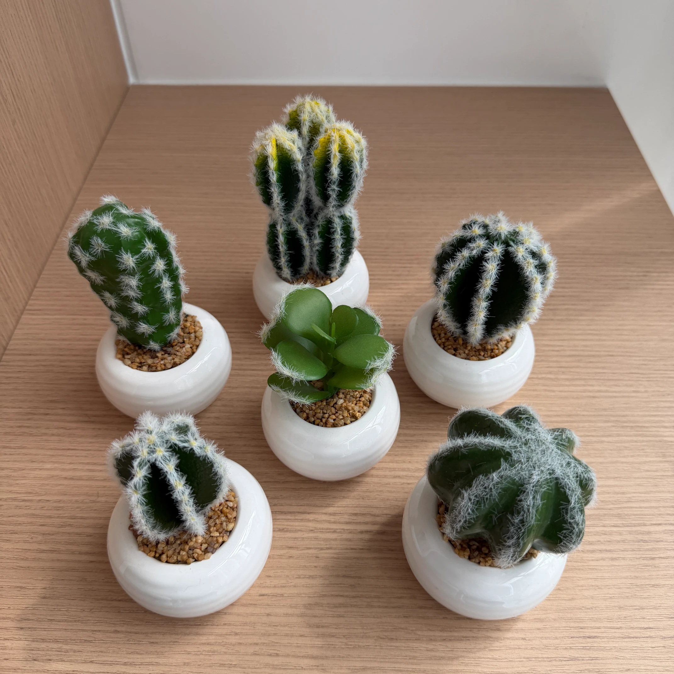 Conjunto de 6 mini cactos artificiais com designs variados, em vasos de cerâmica branca brilhante. Sem rega ou manutenção, perfeito para dar um toque desértico e charmoso a ambientes internos.