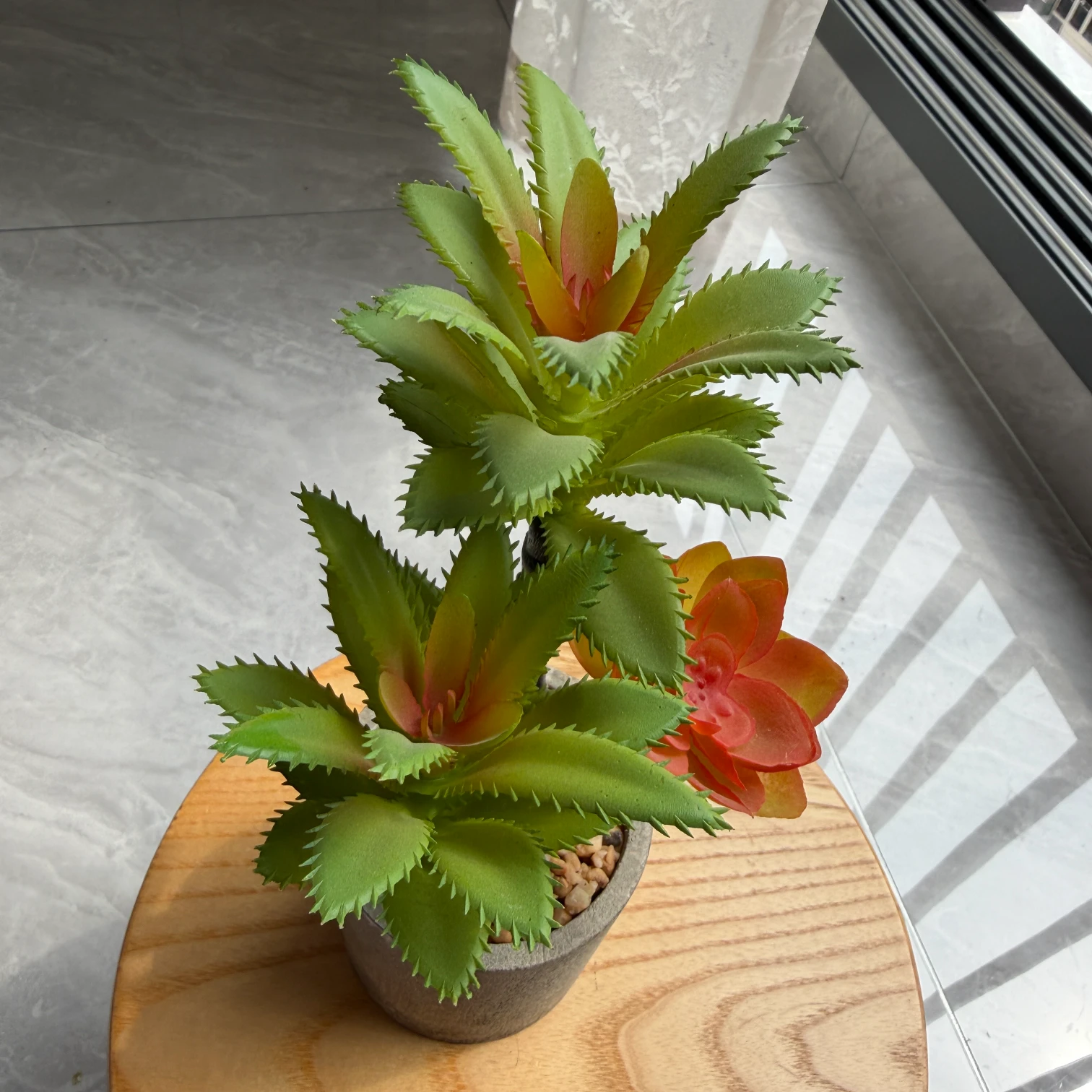 Planta artificial suculenta com 3 rosetas, folhas verdes serrilhadas e detalhes vermelhos, em vaso de cimento cinza. Sem manutenção, ideal para decoração tropical de interiores.