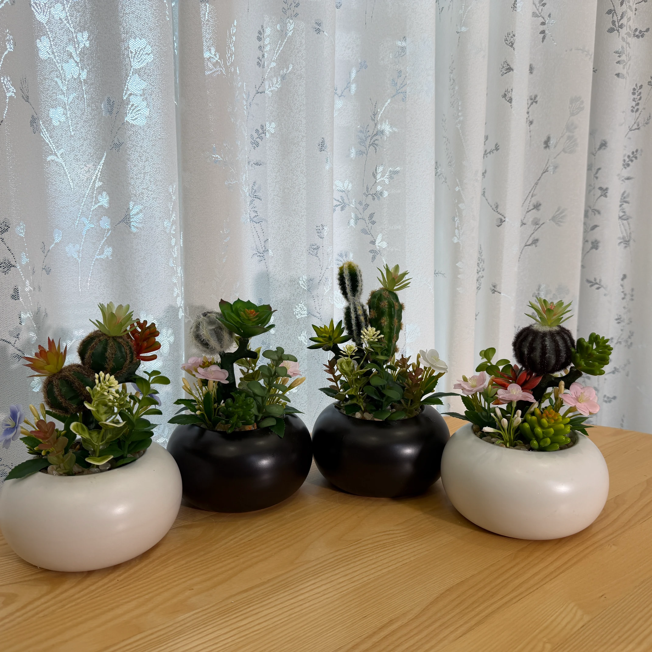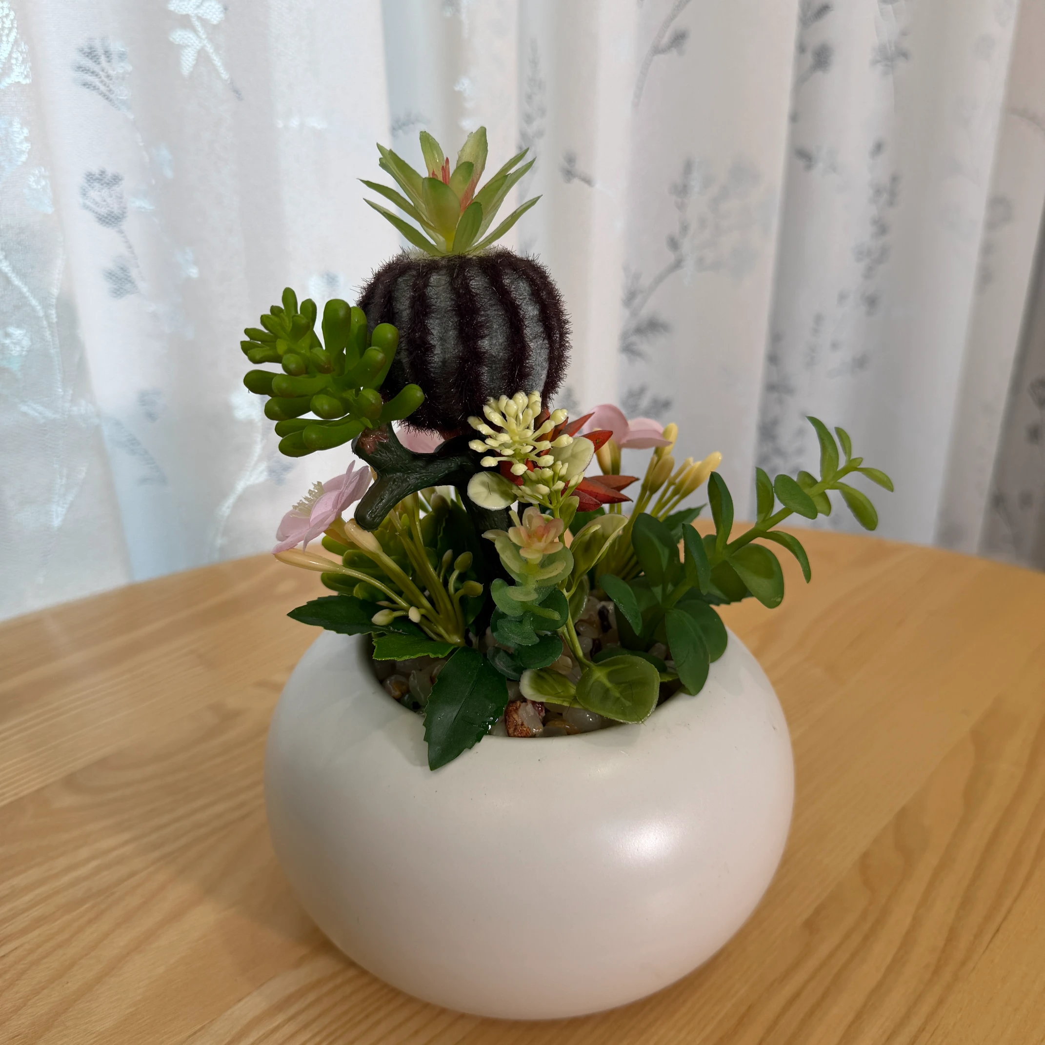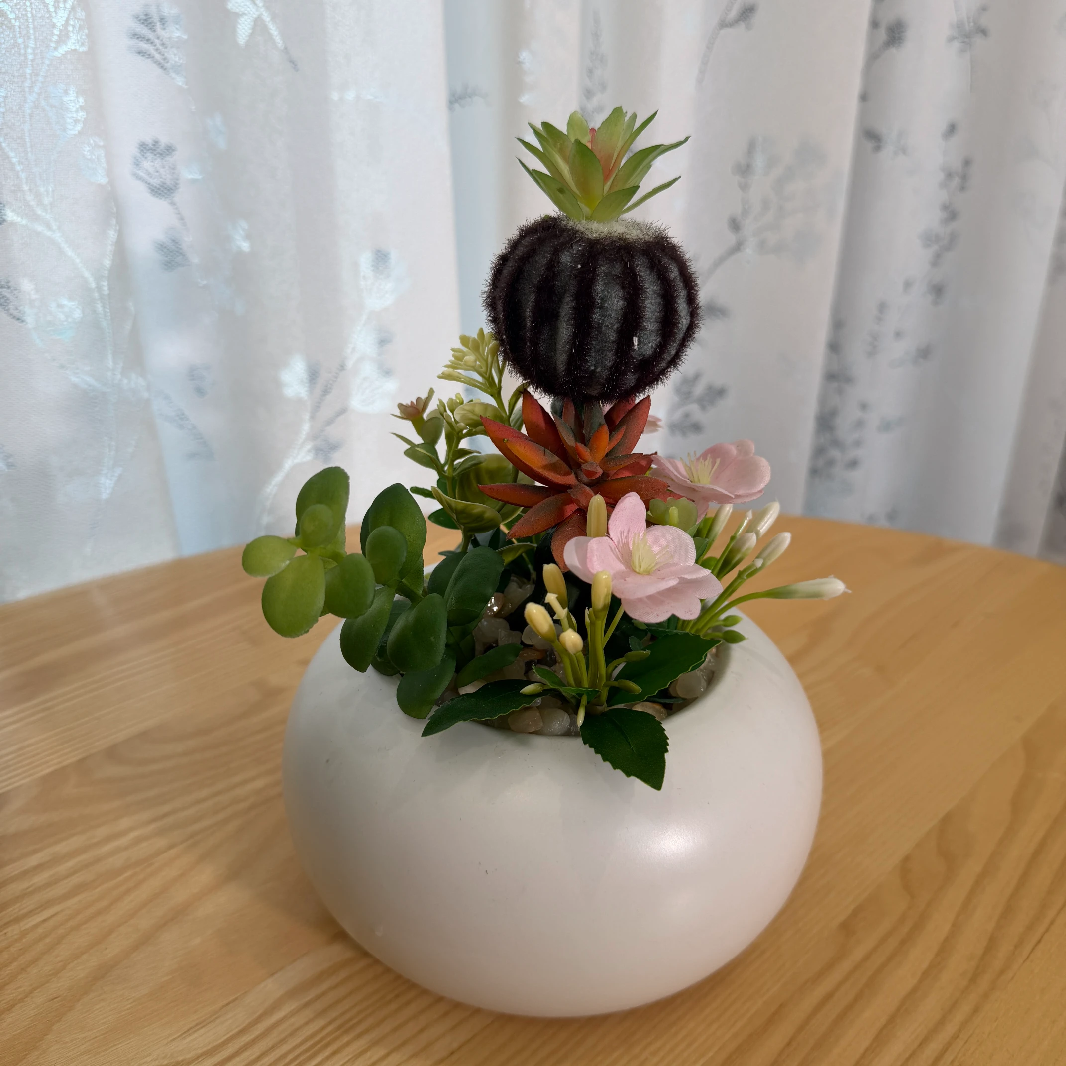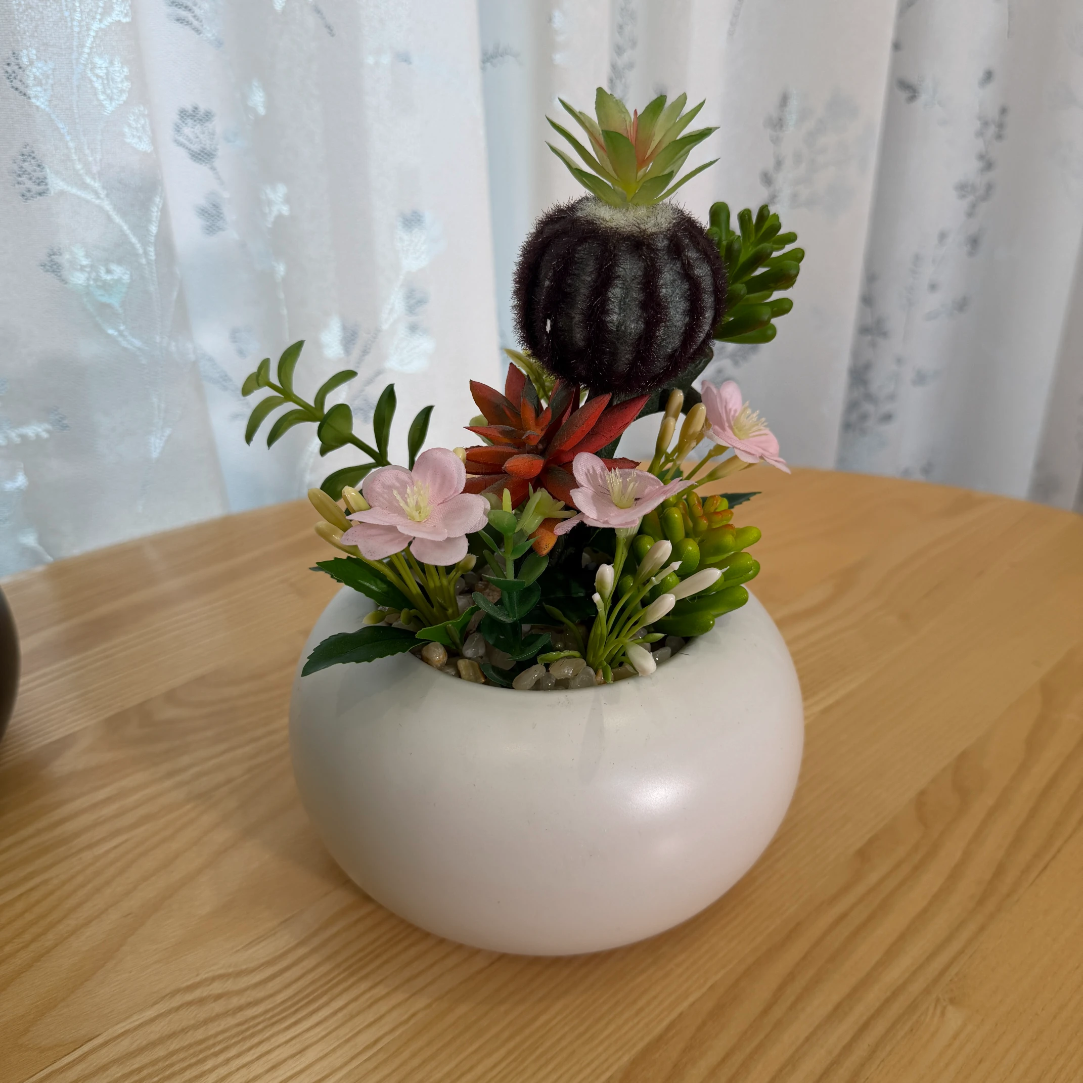 Este arranjo de cactos e suculentas artificiais combina um cacto peludo escuro, suculentas em tons de vermelho e verde, e flores rosadas delicadas, montado em um vaso branco liso e redondo. Totalmente artificial, não necessita de rega, luz solar ou cuidados, trazendo um toque de charme e natureza para qualquer ambiente.