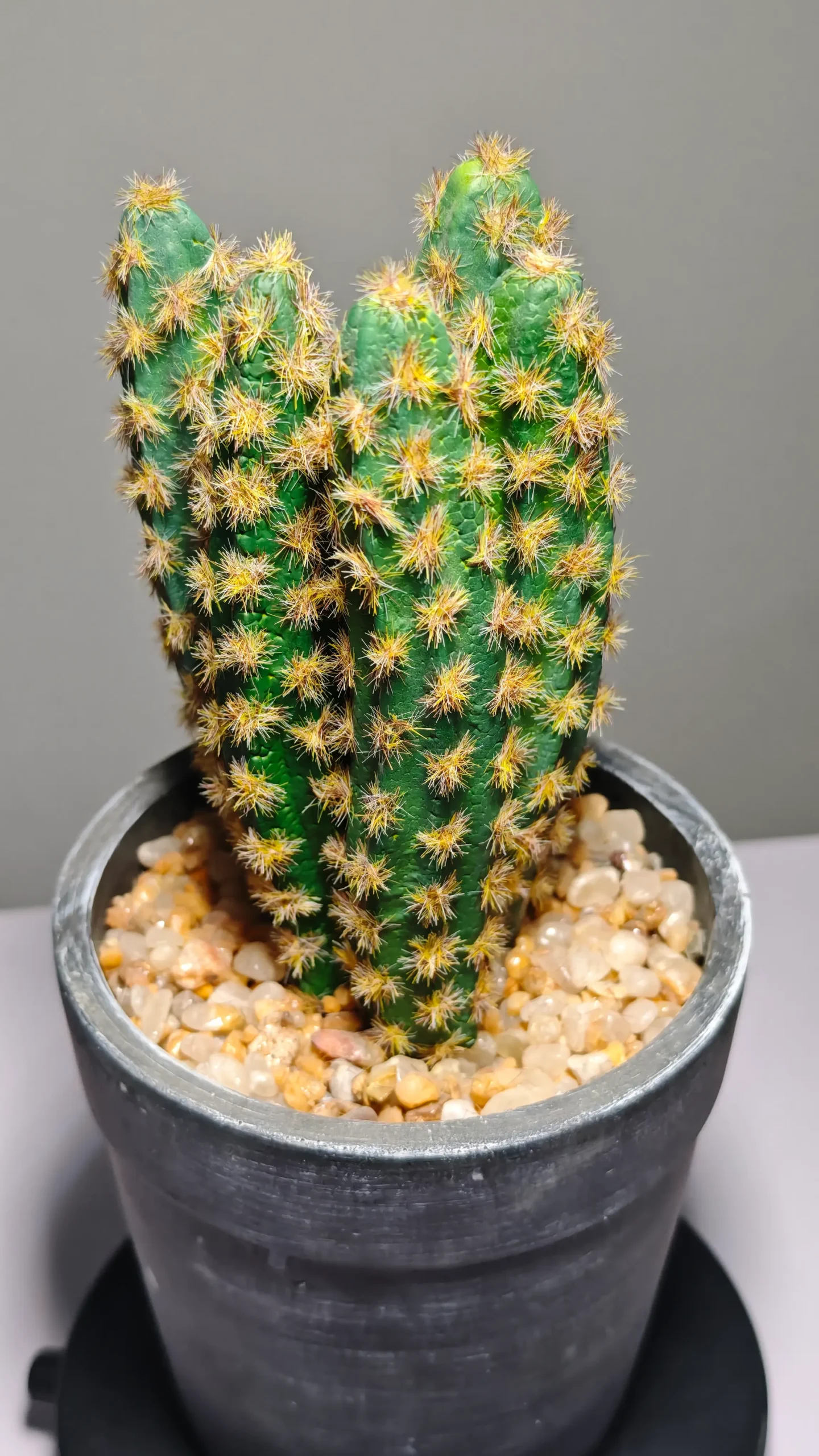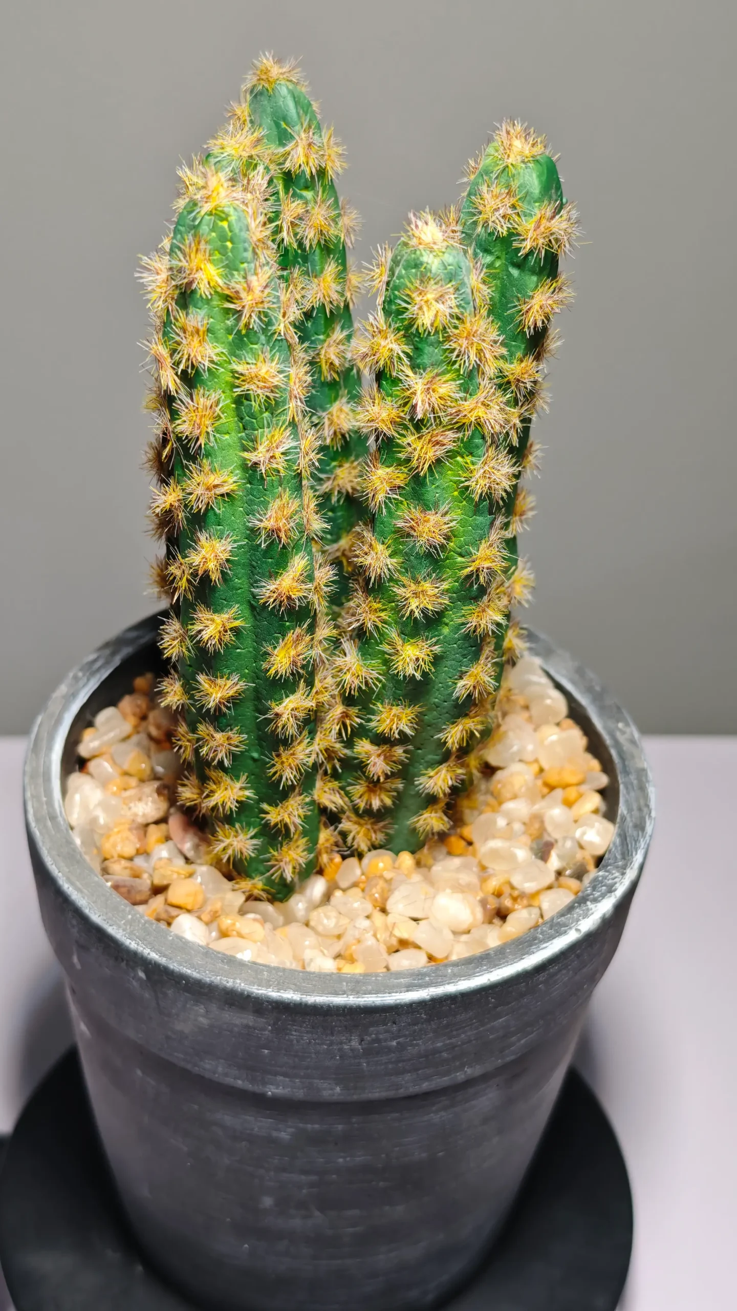 La maceta de cerámica gris oscuro con un acabado rústico complementa perfectamente el diseño natural de los cactus. Además, su base decorada con piedras aporta un toque moderno y elegante que se adapta tanto a escritorios profesionales como a estanterías o zonas de estar.