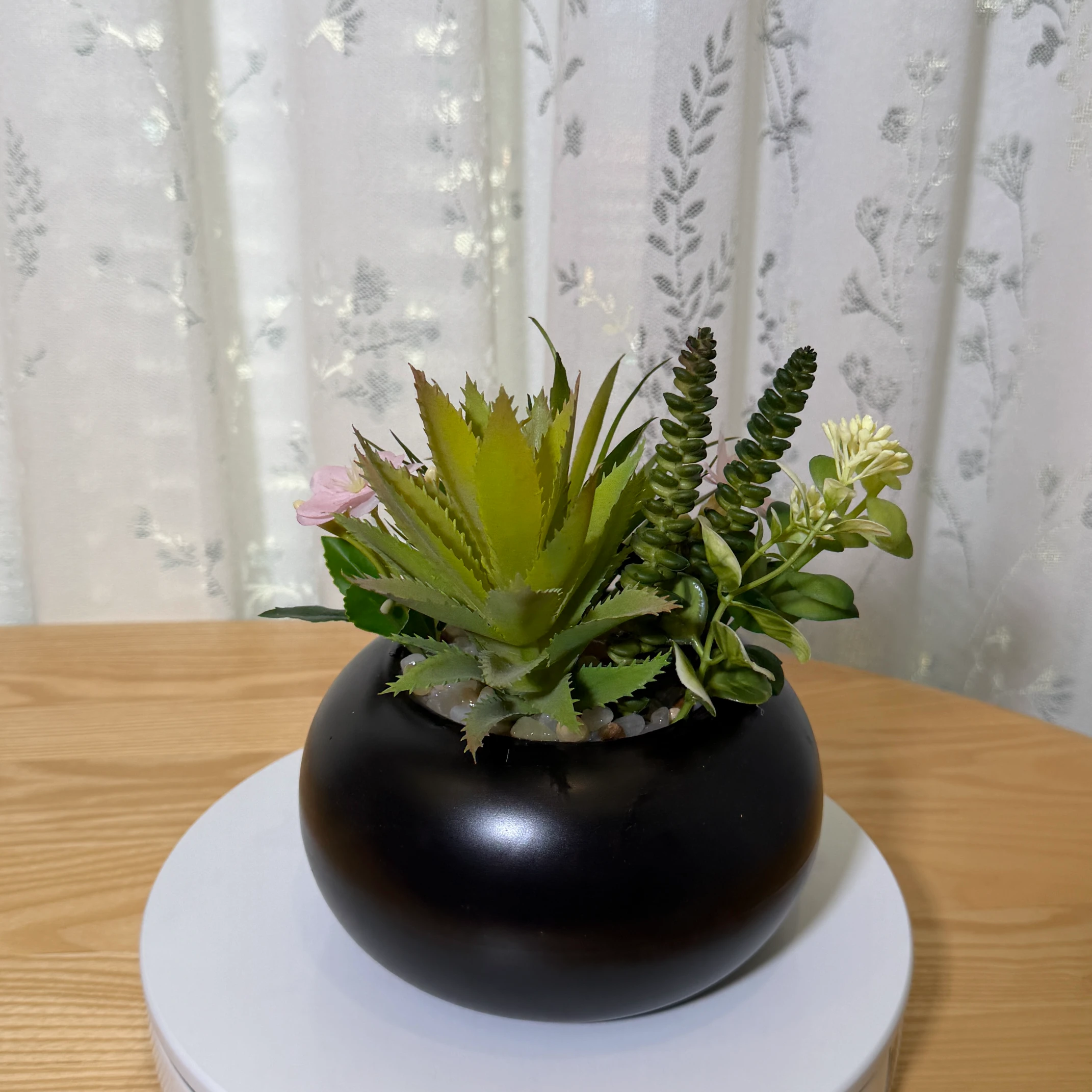 Arranjo de Suculentas Artificiais com Flor Lilás | Vaso Preto Brilhante | Decoração de Mesa
