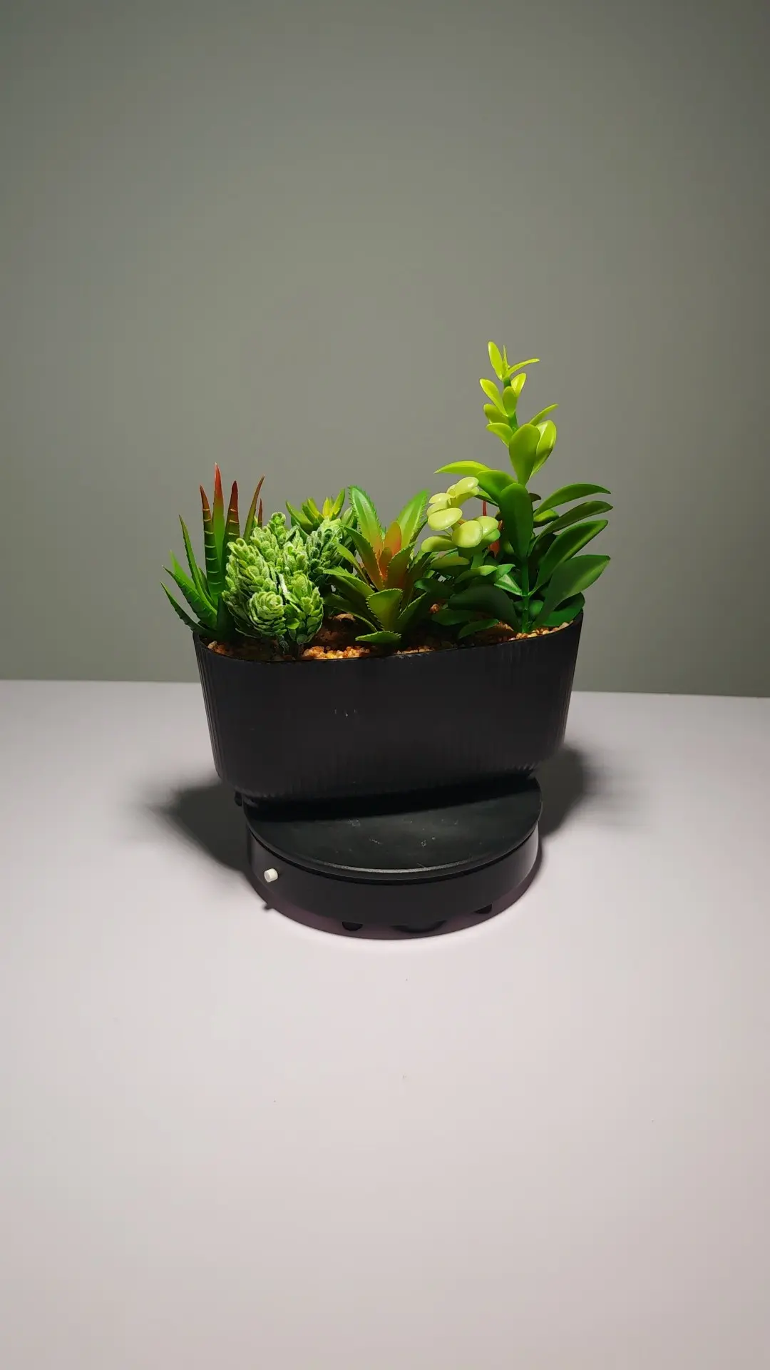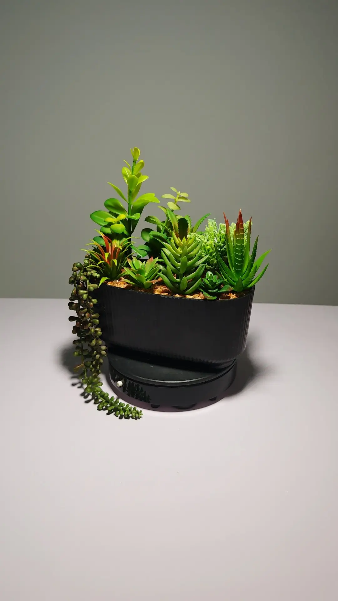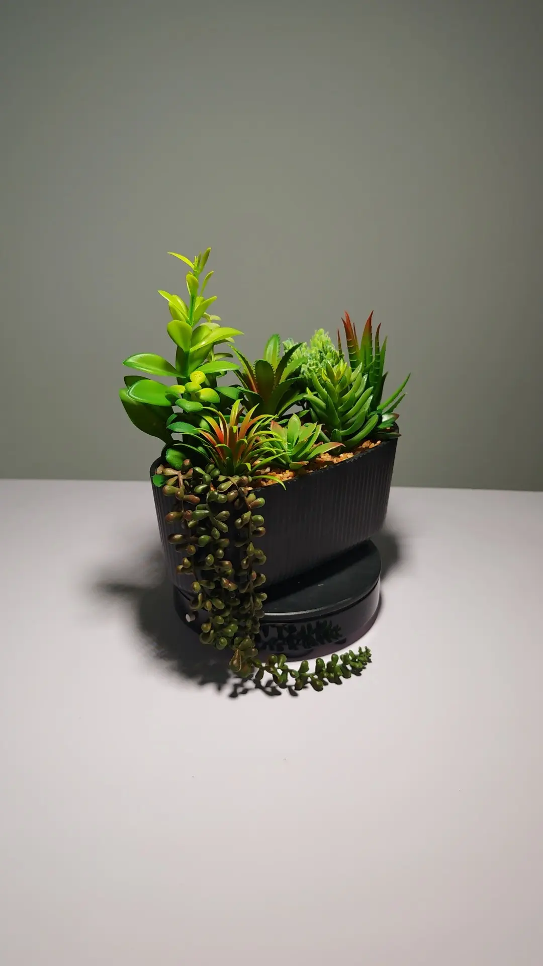 Las suculentas de dedos naranjas, tipo aloe, de roseta y de perlas verdes están confeccionadas con gran realismo. Además, vienen en una sofisticada maceta ovalada de cemento gris con el mensaje grabado “FLOWERS & PLANTS”, proporcionando una estética industrial moderna. Las piedras decorativas completan el look auténtico del conjunto.