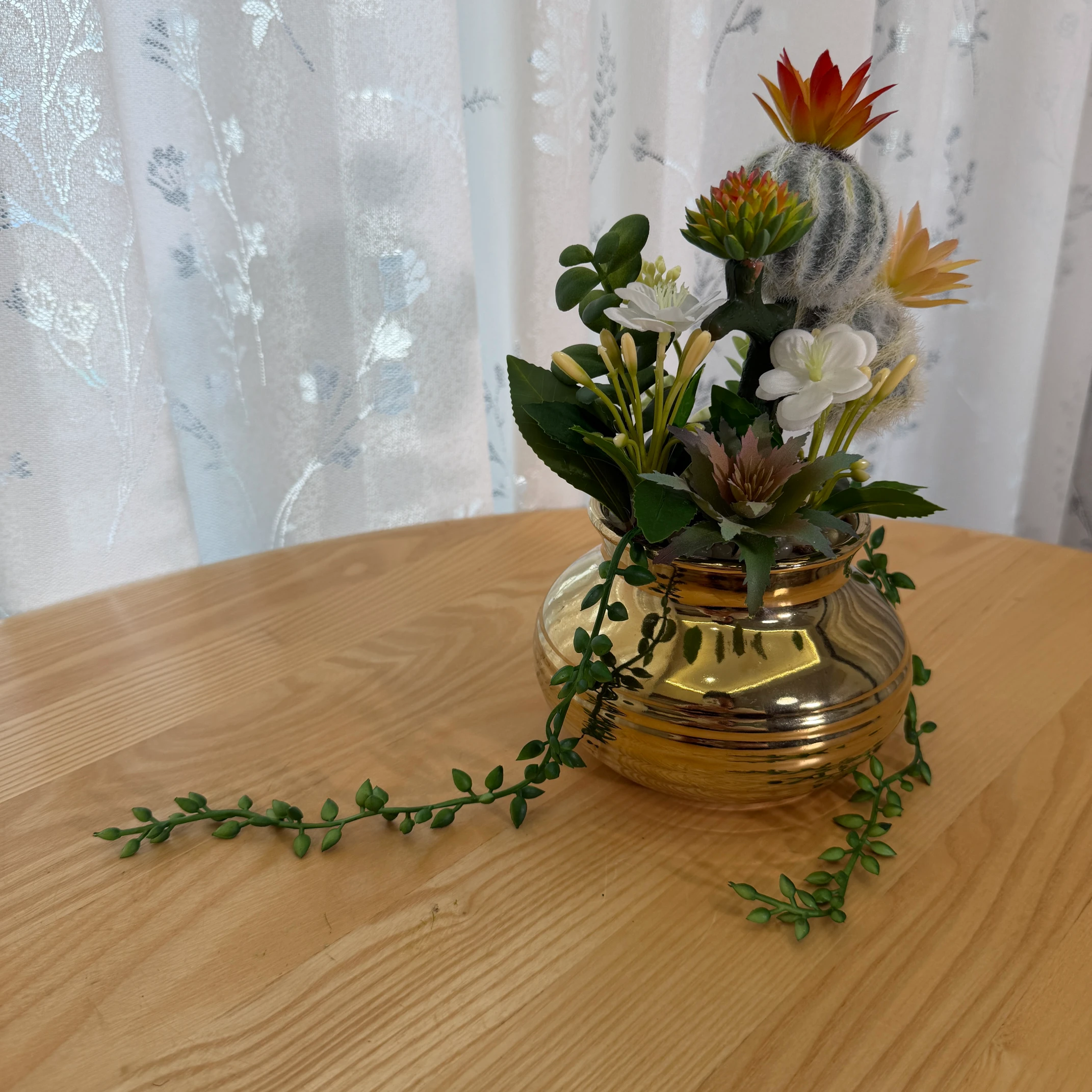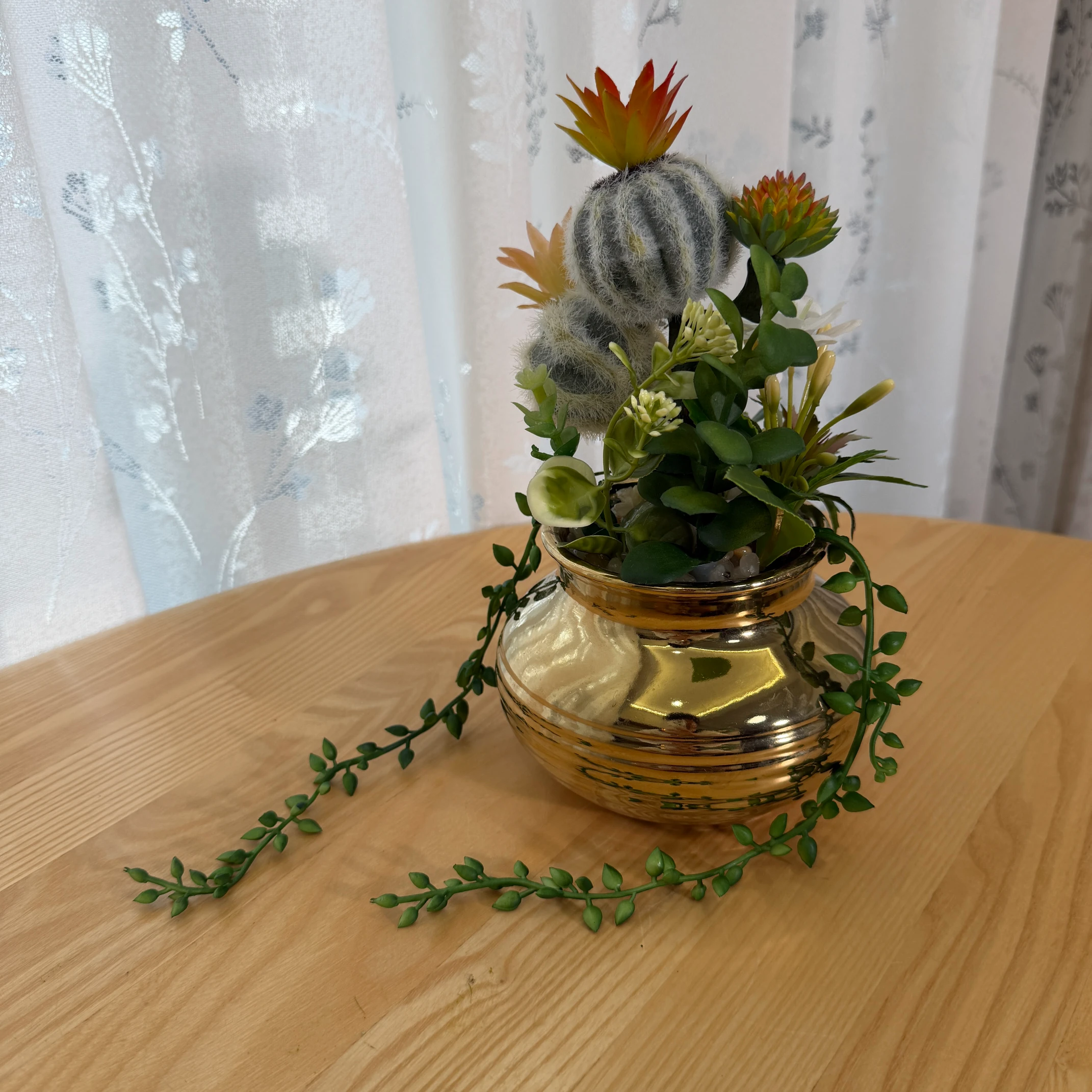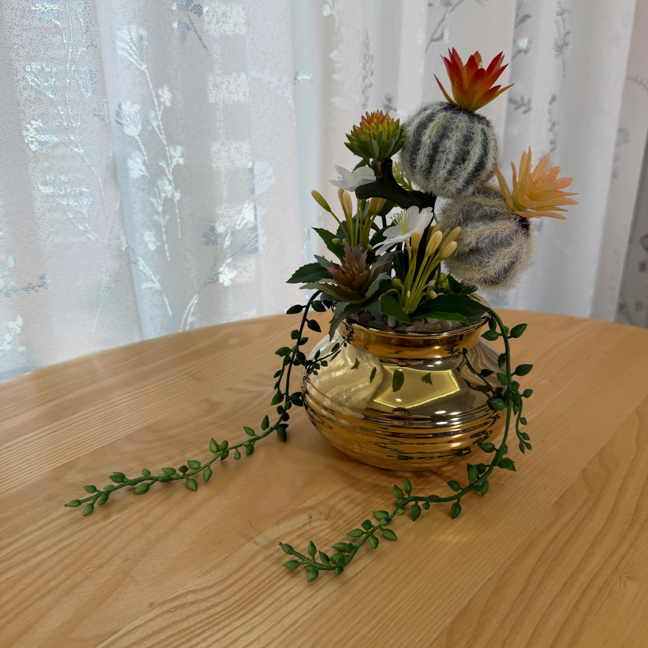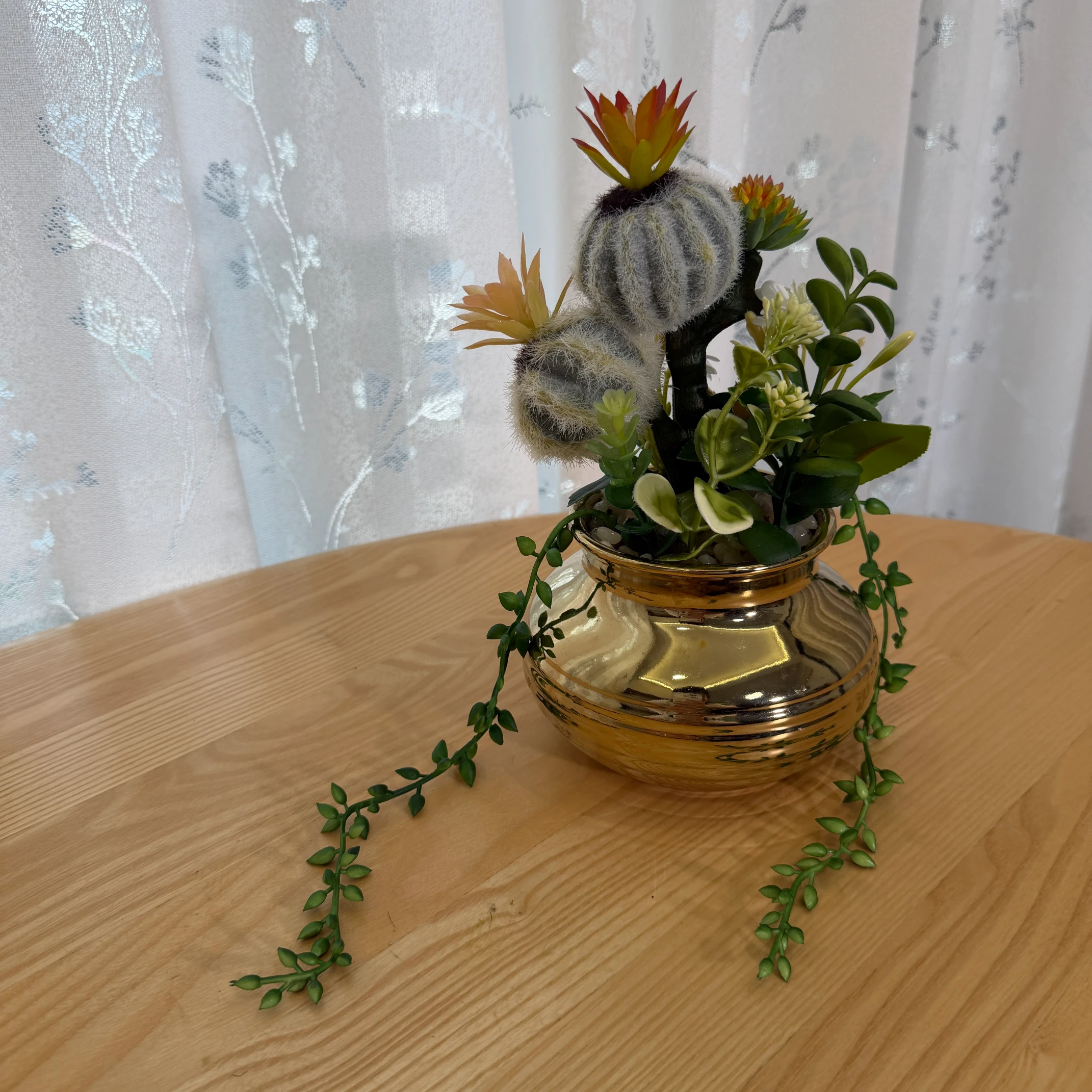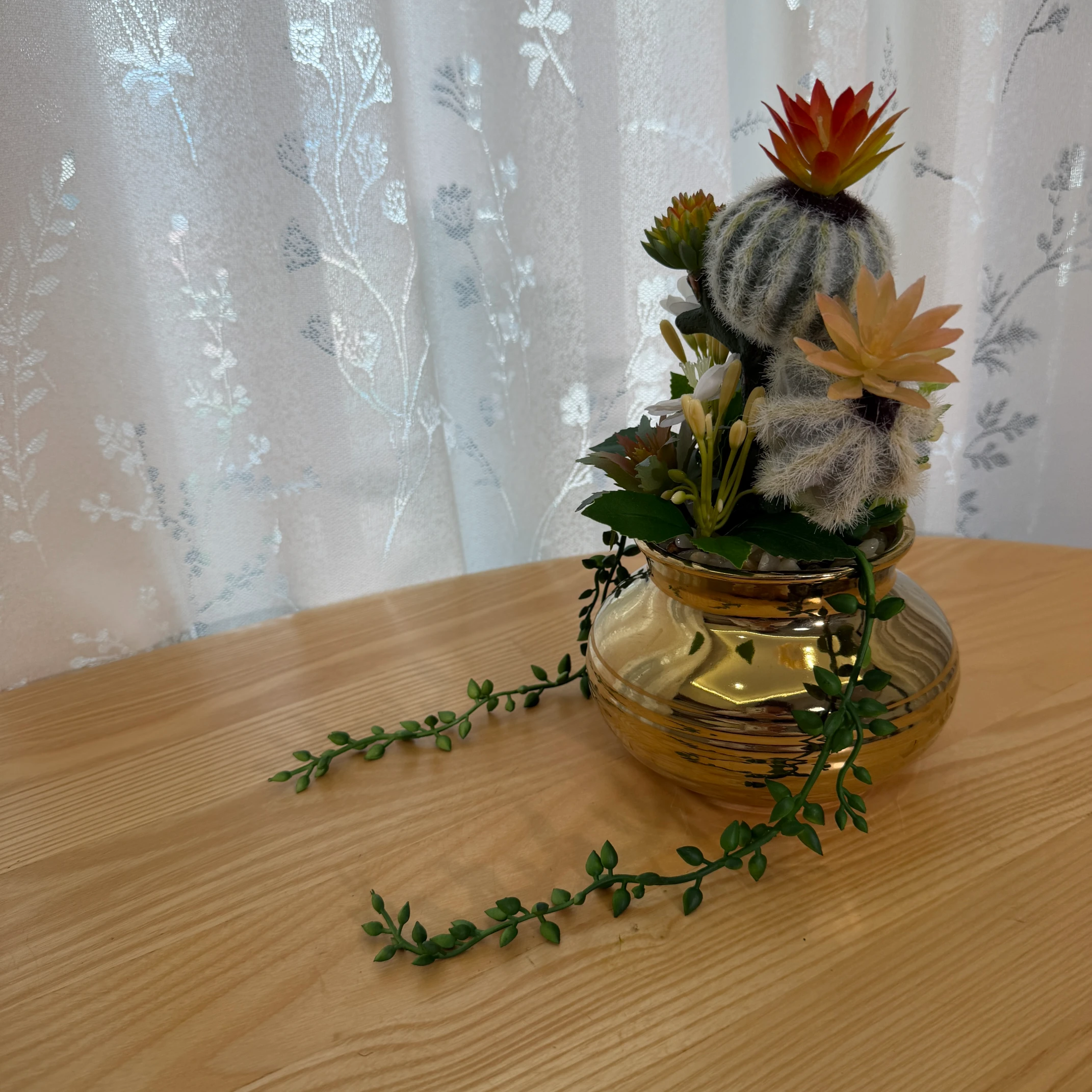 Este arranjo de cactos e suculentas artificiais combina um cacto peludo, flores brancas delicadas e suculentas em tons de vermelho e laranja, montado em um vaso dourado metálico com acabamento brilhante. Possui 2 hastes pendentes que se estendem elegantemente pela superfície. Totalmente artificial, não necessita de rega, luz solar ou cuidados, trazendo um toque de luxo e natureza para qualquer ambiente.